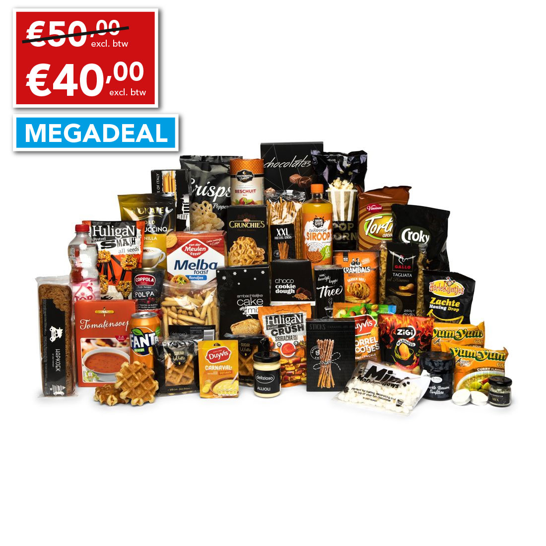 40 artikelen voor slechts 40 euro! Wauw, wat zullen ze verrast zijn tijdens het uitpakken. Er komt maar geen eind aan. De vari?teit aan producten valt gegarandeerd in de smaak bij jong en oud. Aan alles is gedacht, ontbijt, lunch, diner en heerlijkesnacks voor tussendoor of bij de borrel. Dat wordt genieten deze kerst.