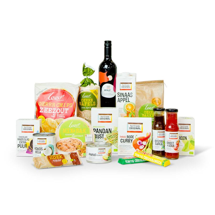 Dit vrolijke pakket zit bomvol leuke Fairtrade producten. Van een Aziatische maaltijd en lekkere tussendoortjes, tot aan wijn en chocolade, dat wordt (h)eerlijk genieten!
