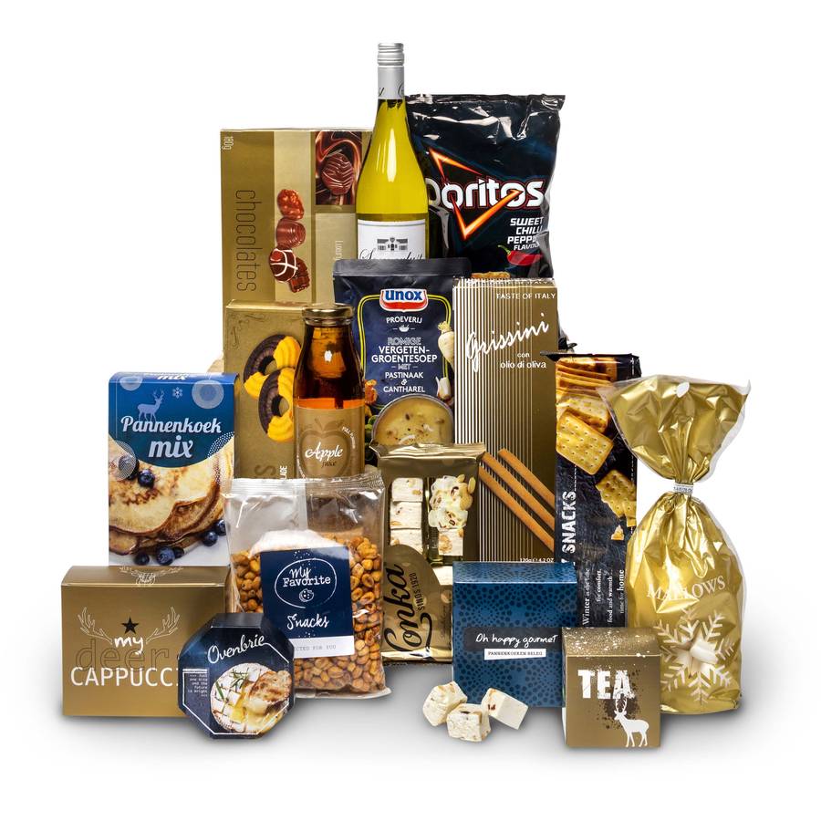 Met dit prachtige sfeervolle kerstpakket kunt u uw waardering laten blijken aan uw medewerkers. Prachtige kleuren als goud en blauw geven dit pakket allure en stijl. Met dit goed gevulde kerstpakket vol heerlijke producten zal de ontvanger zich echtblij en gewaardeerd voelen!