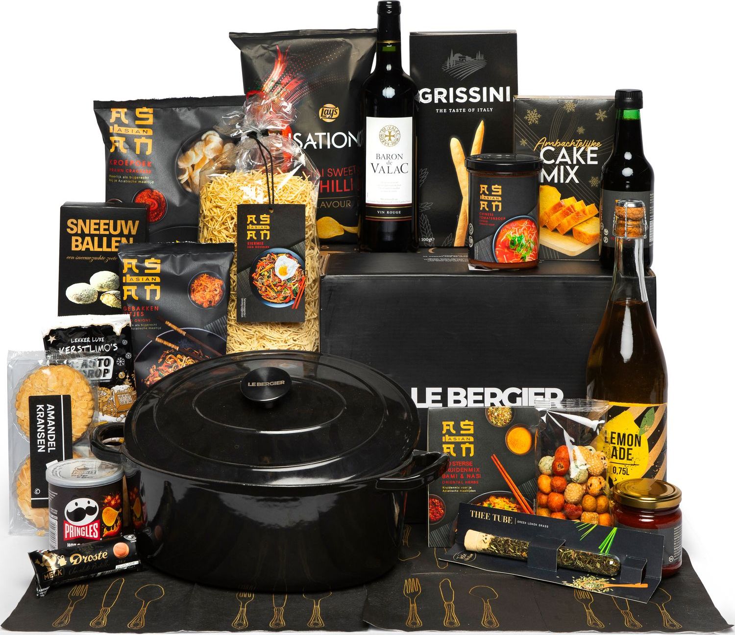 Met dit culinaire kerstpakket zet je in een handomdraai een smaakvolle Oosterse maaltijd op tafel. In de sterke gietijzeren Le Bergier braadpan bereid je de allerlekkerste stoofpotten, heerlijk mals vlees en zelfgemaakte sauzen. Je kunt de pan op elke warmtebron gebruiken en hij mag ook in de oven. Een pan voor het leven en daarom duurzaam. Deze royale krachtpatser wil iedereen wel ontvangen.