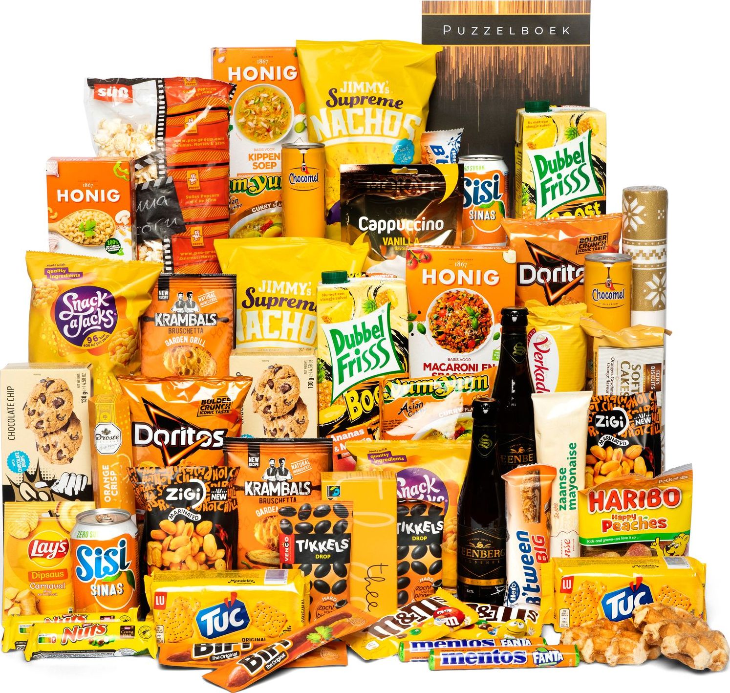 De ontvanger van dit bomvolle a-merken kerstpakket zal zeker in zijn nopjes zijn. Het bevat allerlei smaakvolle producten die goed van pas komen tijdens de feestdagen. Het puzzelboek is superleuk voor jong en oud.