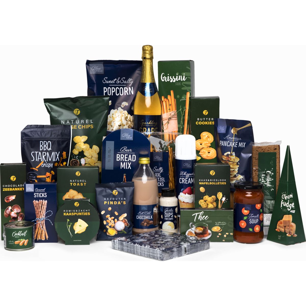 Met dit rijk gevulde blauw groene kerstpakket kunt u echt uitpakken en uw waardering laten blijken aan uw medewerkers. Een smulpartij voor het hele gezin. Vele lekkere gevarieerde artikelen waarmee u makkelijk een hele dag kunt vullen. Aan ieders wilis gedacht, zowel jong als oud.