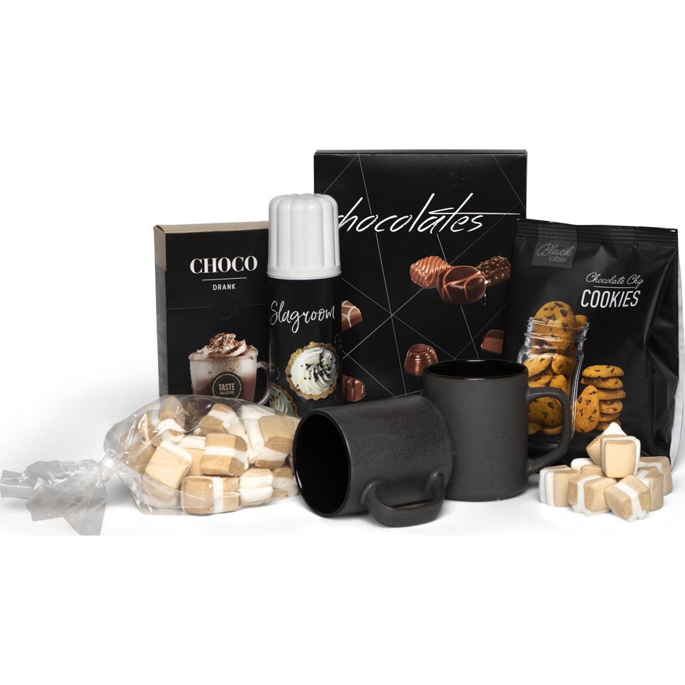 Met dit pakket geniet u van een heerlijke warme chocomel met een flinke toef slagroom, verrukkelijke chocoladekoekjes, mallows en romige bonbons. De superleuke mokjes komen altijd goed van pas.