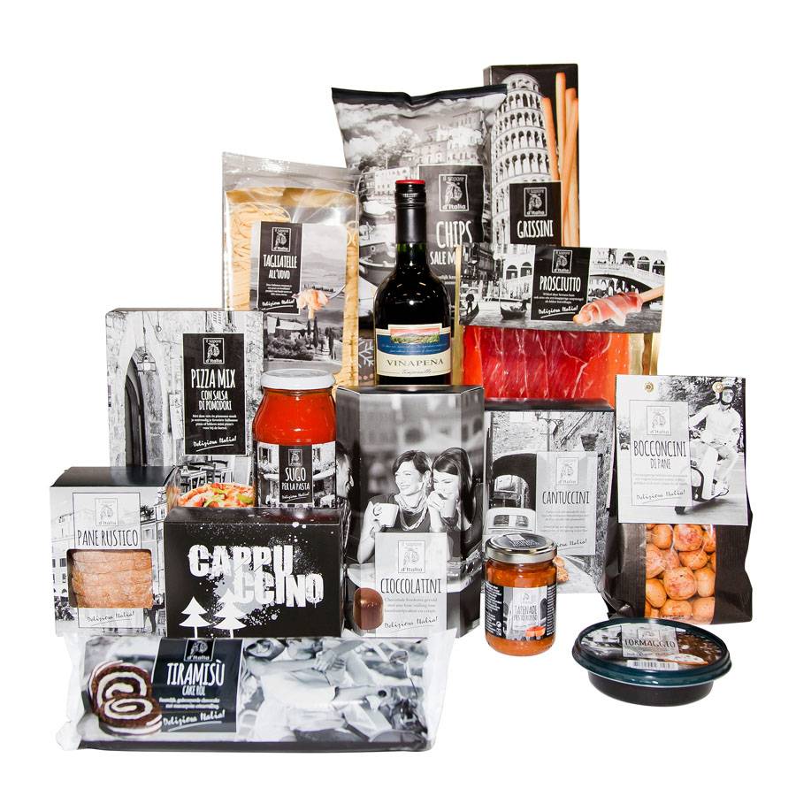Dit smaakvolle kerstpakket ademt de kenmerkende sfeer van Italië uit. Heerlijke producten als tagliatelle, pizzamix, cantuccini, tiramisu cake of tapenade, u vindt het in dit rijk gevulde Italiaanse kerstpakket!