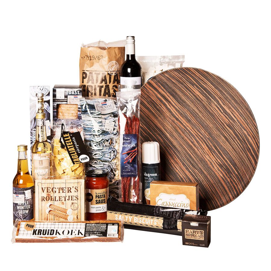 Stoer en stevig, dat is de uitstraling van dit pakket. Bomvol heerlijke producten voor iedereen. En gebruik het onderbord om uw tafel sfeervol te dekken tijdens het diner. Bon apetit!
