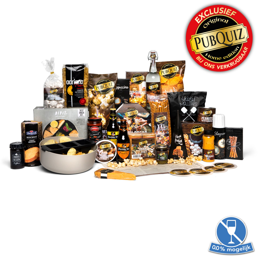 Met dit bomvolle PubQuiz pakket kunt u echt uitpakken want er is aan iedereen gedacht. Jong, oud, man en vrouw, echt iedereen wordt blij van dit rijk gevulde pakket. Met dit pakket beleeft u gegarandeerd een gezellig avond met vrienden of familie. Ende handige Dipit serveerschaal met dipbakje is een eyecatcher op iedere tafel.