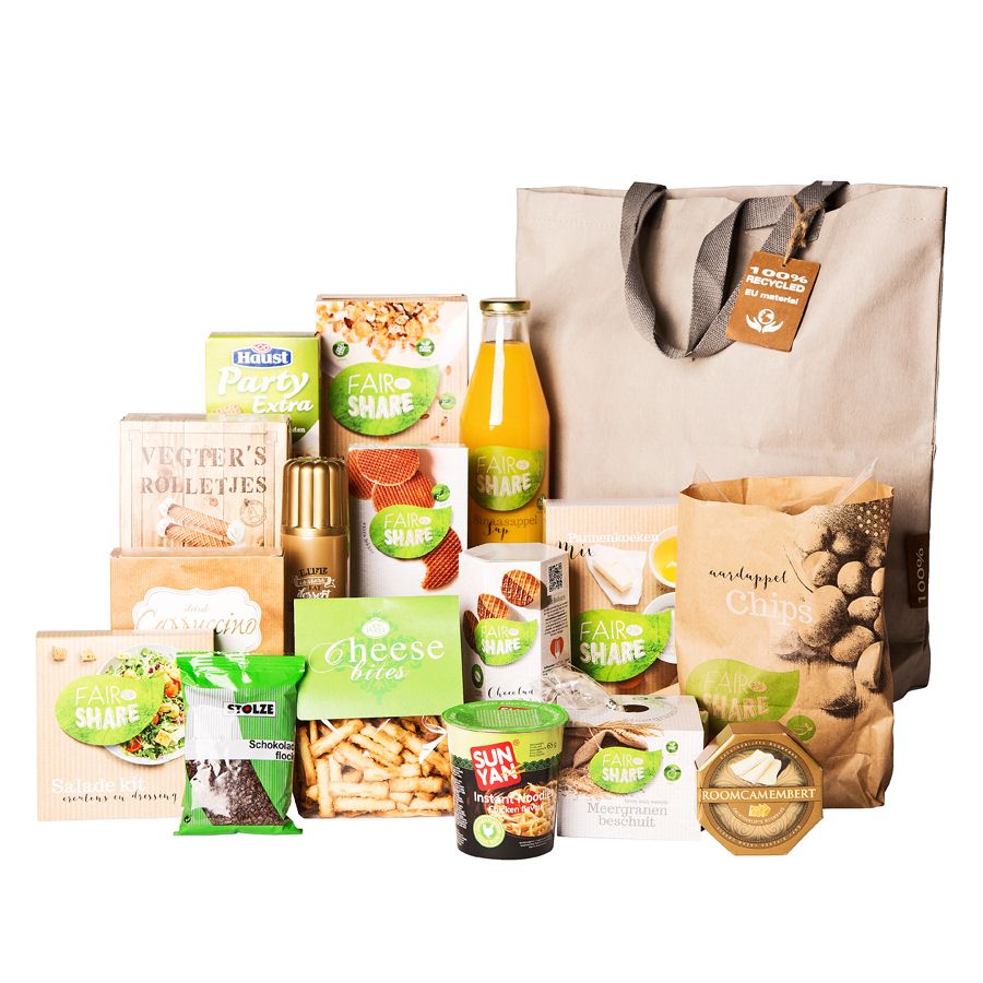 De puurheid van de producten uit dit prachtige pakket wordt versterkt door de natuurlijke uitstraling met kraft bruin, wit en frisgroen. Daarnaast gaat van elk product uit de Fair & Share lijn een deel van de opbrengst naar het goede doel! Dat is dubbel genieten. De mooie tas is gemaakt van gerecycled papier.