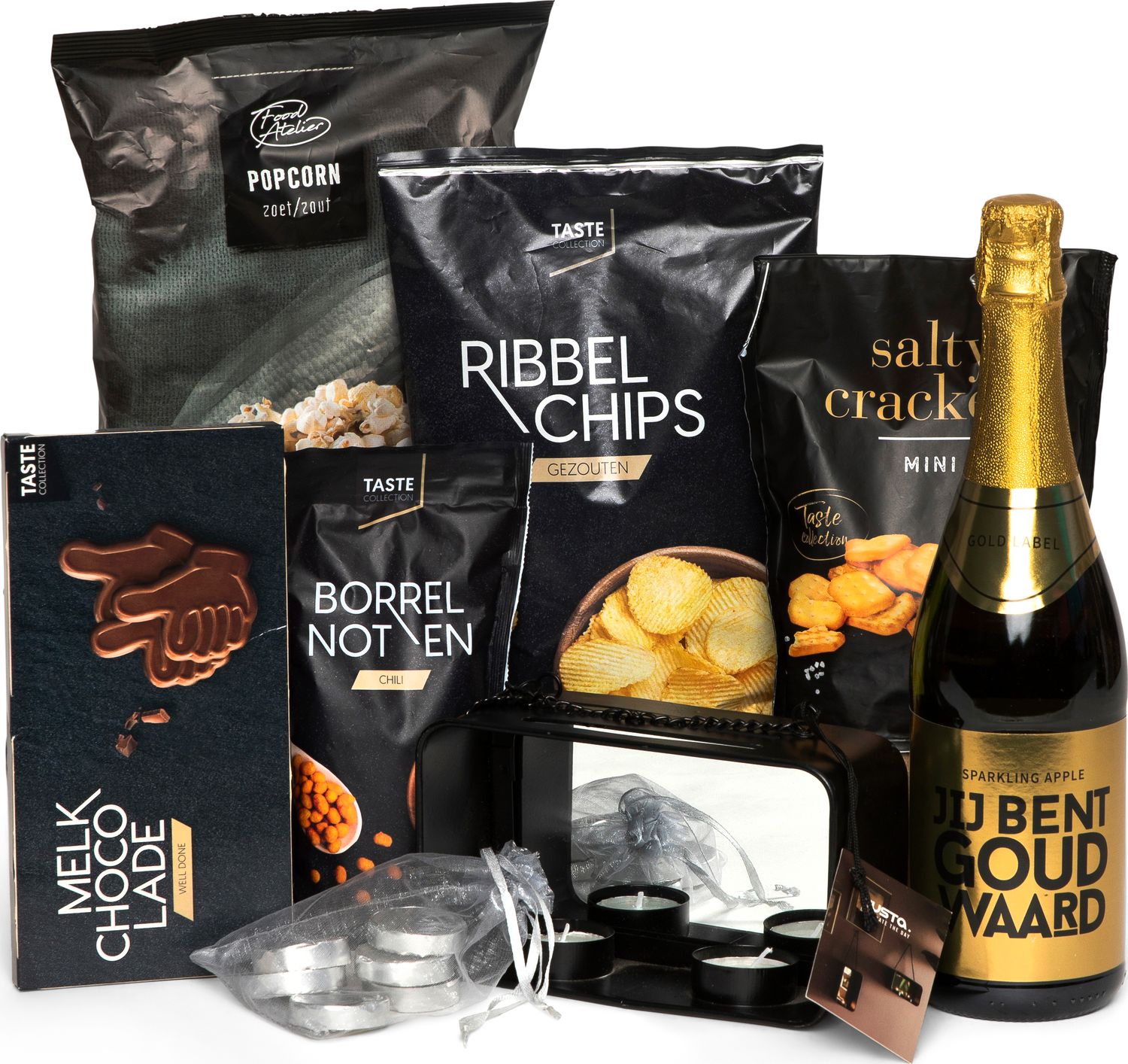 Dit kerstpakket garandeert een gezellige avond met vrienden of familie. Wij hebben de doos tot de rand toe gevuld met lekkere hartige artikelen. De zwart metalen wand theelichthouder met spiegeltje en ophangkoortje is een echte eyecatcher en zorgt voor extra sfeer. Fijne avond.