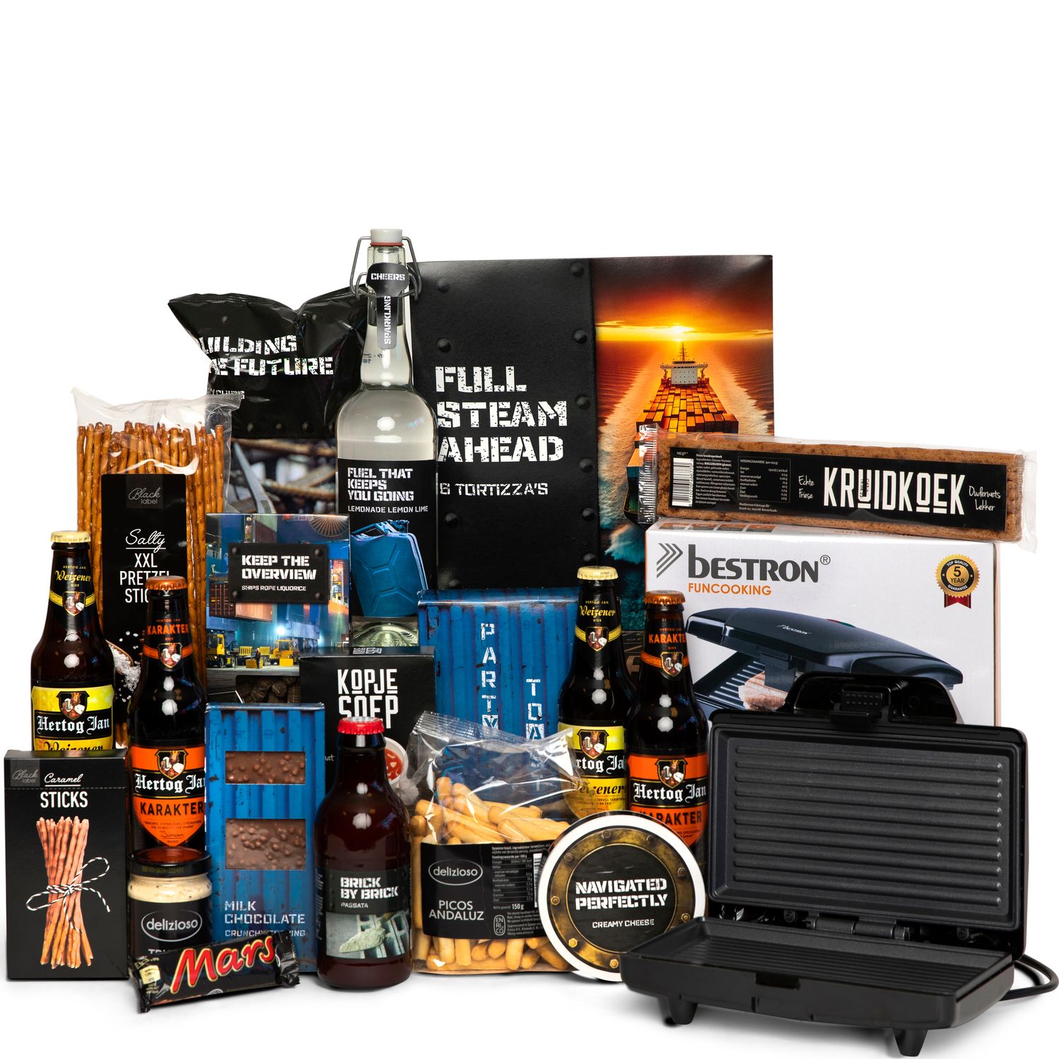 Dit stoere kerstpakket bevat een luxe Bestron sandwichgrill. Met deze handige grill maak je in een handomdraai 2 heerlijke sandwiches. Hij heeft een compact ontwerp en is een uitstekende aanvulling op je keuken. De grillplaten zijn voorzien van een anti-aanbaklaag, hierdoor zijn ze afwasbaar en zeer makkelijk schoon te maken. Veiligheidsvoorzieningen zijn onder meer een aan- en gereed-indicatielampje. Het apparaat heeft ook een geïntegreerde handgreep dat ontworpen is om de sandwichmaker zo platmogelijk te houden, zodat je de grill zelfs horizontaal en verticaal kunt opbergen
