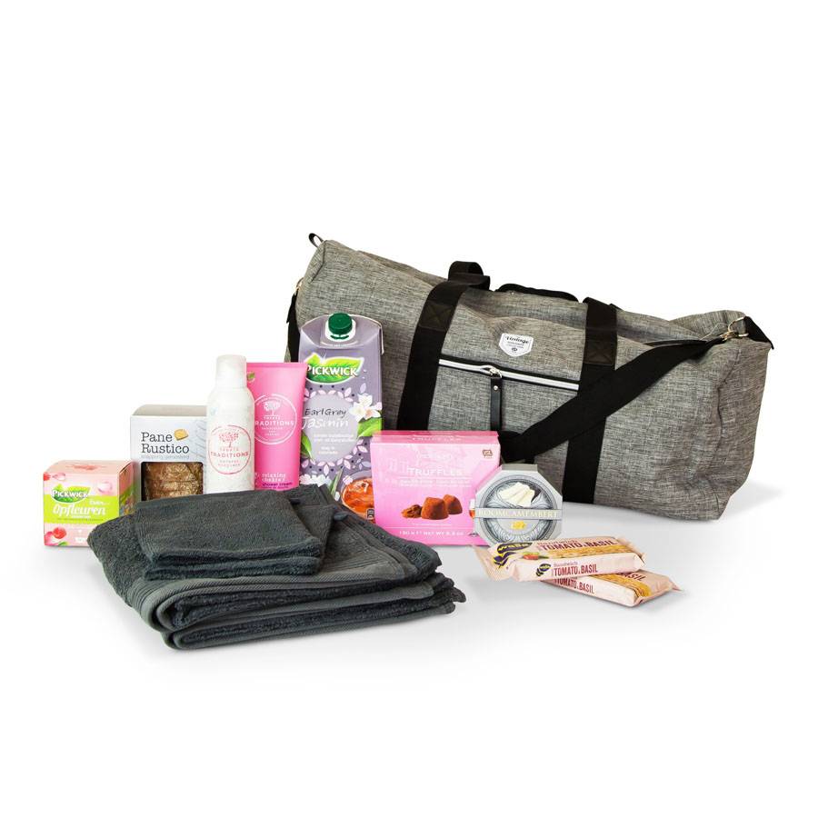 Wat een luxe om dit kerstpakket uit te mogen pakken. Een goed gevulde trendy weekendtas boordevol met heerlijke lekkernijen en een lekkere warme handdoek met washandje. Geniet ervan!