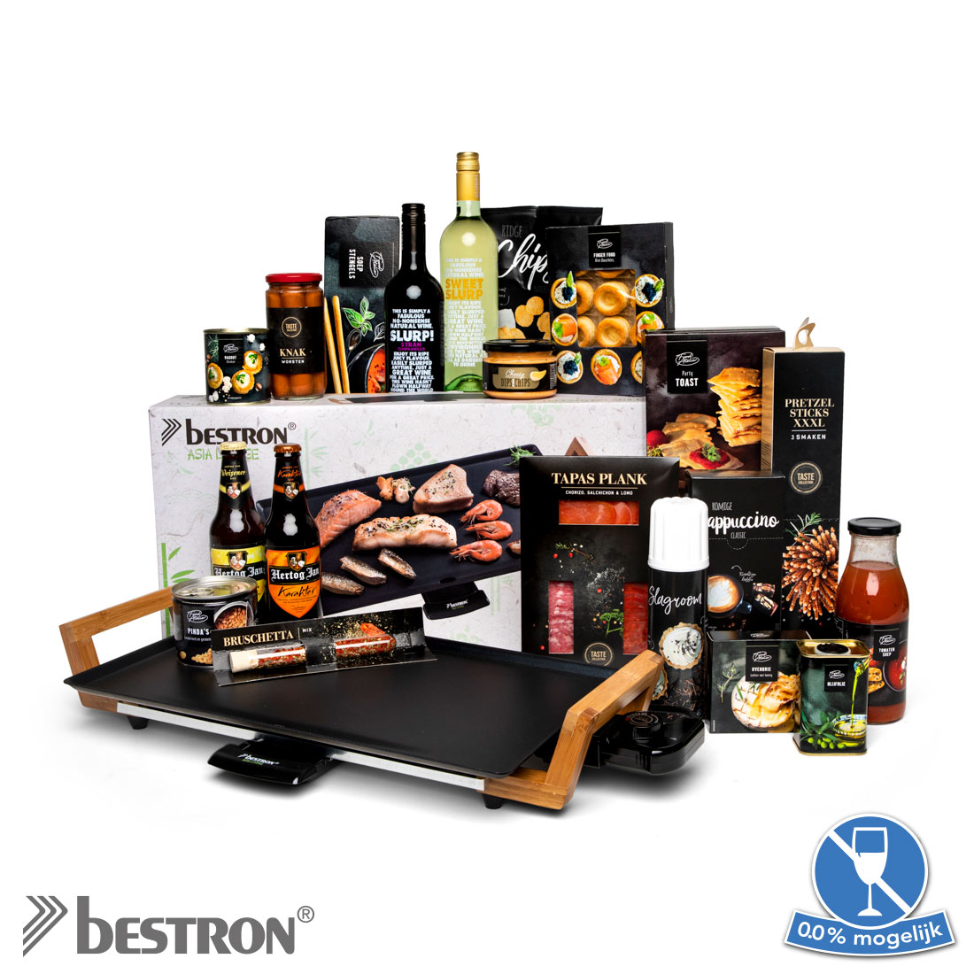 Met dit geweldige kerstpakket kunt u uw waardering laten blijken aan uw medewerkers en ze bedanken voor hun inzet. Wat zullen ze verrast zijn. De doos is tot de rand gevuld met heerlijke producten. Maar dat is nog niet alles, want we hebben ook nog een mooie bakplaat toegevoegd. Met de Bestron teppanyaki bakplaat bakt u de heerlijkste stukken vlees, groenten en vis. Ideaal om gezellig samen op een bakoppervlakte van 46 bij 26 cm uw eigen favoriete gerechtjes te bakken.