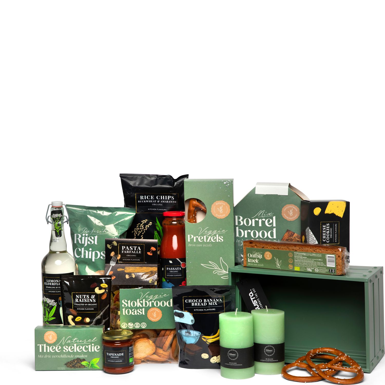 Dit pakket omvat allerlei vormen van duurzaamheid op het gebied van foodproducten. Van biologische producten en de Rain Forest Alliance tot vezelrijk voedsel of minder suikers en dus een betere keuze voor je gezondheid. Ook zijn betere keuzes gemaaktop het gebied van verpakkingen. Zo hebben we gebruikgemaakt van mono-verpakkingen, minder verpakkingsmateriaal en beter recyclebare verpakkingen. En van de Pure producten uit dit pakket zal van elk product € 0,10 afgedragen worden aan de Voedselbank. In de handige metalen kist kunt u van alles opbergen. En voor wat extra sfeer hebben we twee mooie kaarsen toegevoegd.