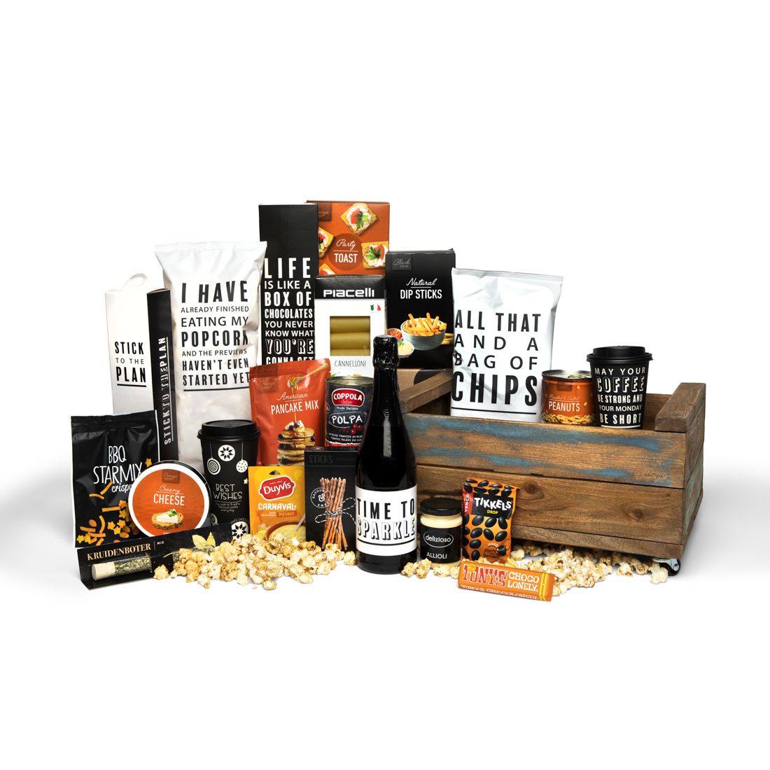 Wij laten ons niet kisten, want u verdient alleen het beste. Een heerlijk kerstpakket met zorg voor u samengesteld.
