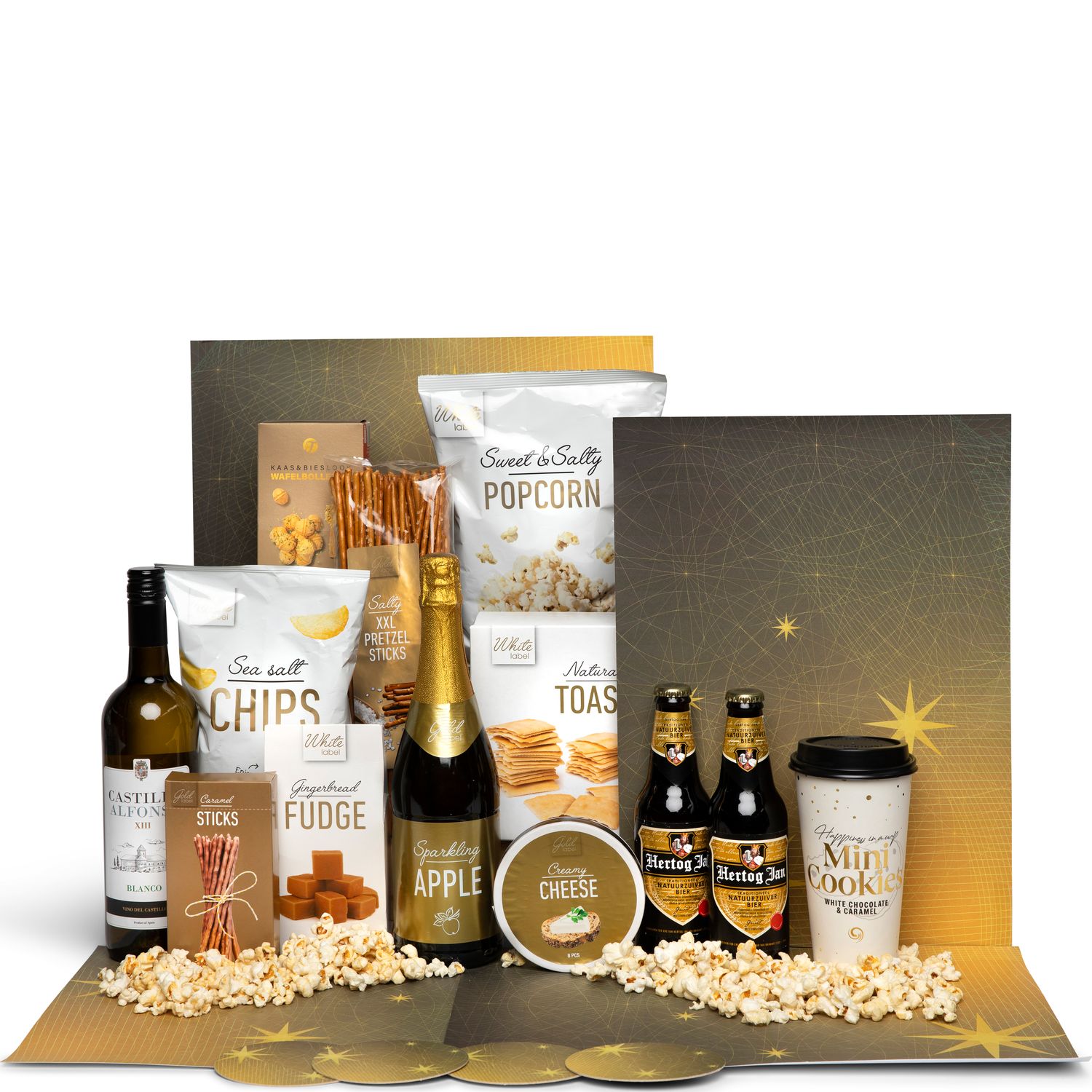 Alles voor een avond gezelligheid met vrienden of familie hebben wij voor u ingepakt. En alleen de lekkerste producten zijn geselecteerd. Een hapje en een drankje, u vindt het allemaal in de superleuke gouden kerstpakket.
