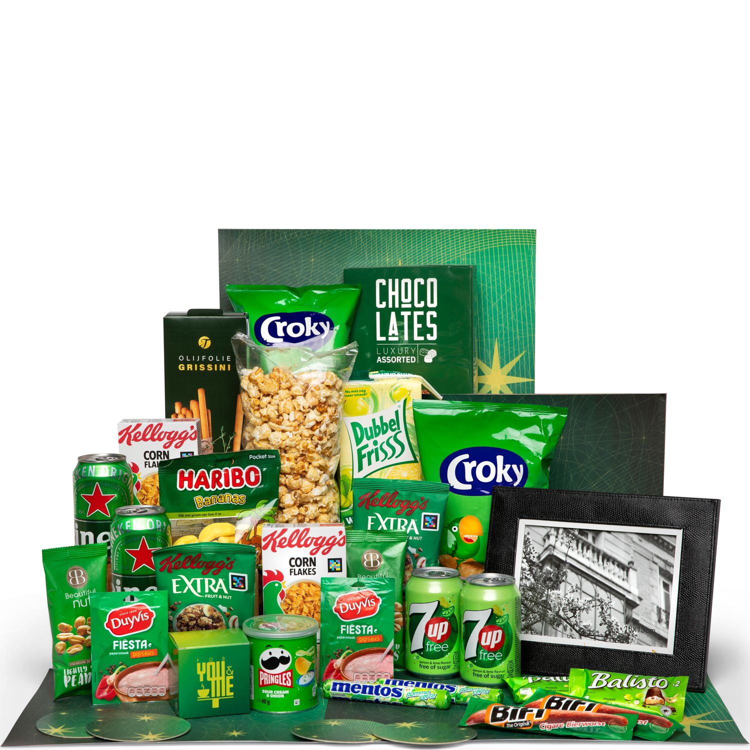 Verras uw medewerkers met dit bomvolle groene A-merken kerstpakket. Het bevat smaakvolle producten die goed van pas zullen komen tijdens de feestdagen. En in het hippe fotolijstje is bedoeld voor uw mooiste en dierbaarste foto.