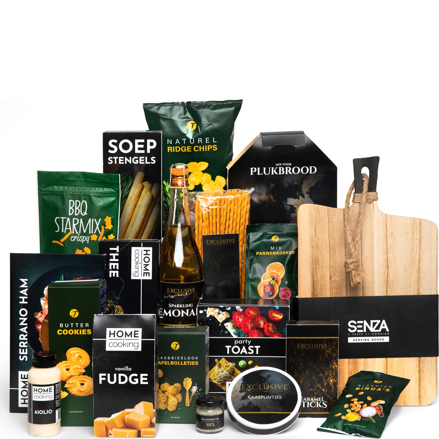 Met dit bomvolle pakket kunt u echt uitpakken want er is aan iedereen gedacht. Jong, oud, man en vrouw, echt iedereen wordt blij van dit rijk gevulde pakket. Met dit pakket beleeft u gegarandeerd een gezellig avond met vrienden of familie. De stijlvolle serveerplank is geschikt voor het serveren van de lekkerste hapjes. Dankzij de zwartkleurige handgreep is de plank eenvoudig te tillen. De plank kan gemakkelijk opgehangen worden met het koord. De plank is gemaakt van Paulownia hout, wat voor eenwarme look zorgt. Dit smaakvolle Home Cooking kerstpakket is gemaakt voor genieters en exclusief bij ons verkrijgbaar.