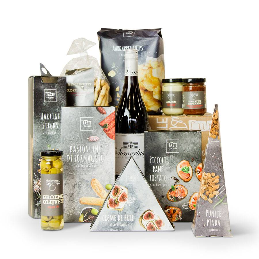 Met dit goed gevulde pakket zijn er lekker veel hapjes voor kerstavond. Neem bijvoorbeeld een mini toastje met crème de brie of zet de chips op tafel. Iedereen blij met kerst!