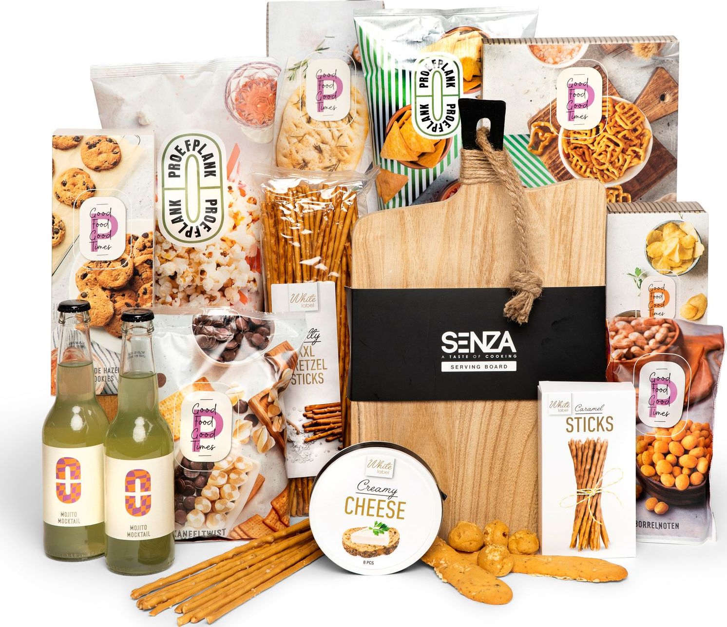 Spreek af met familie of vrienden voor een gezellige avond. Met dit rijk gevulde pakket ben je verzekerd van de lekkerste hapjes en drankjes. De stijlvolle serveerplank is geschikt voor het serveren van de lekkerste hapjes. Dankzij de zwartkleurige handgreep is de plank eenvoudig te tillen. De plank kan gemakkelijk opgehangen worden aan het koord en is gemaakt van Paulownia hout, wat voor een warme look zorgt.