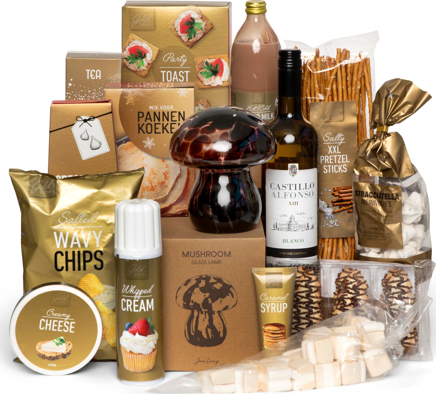 Dit lampje in de vorm van een paddenstoel is een knusse toevoeging voor in huis.(Let op! Lampje is nog alleen beschikbaar in wit) De lamp werkt op twee AA batterijen en is voorzien van een leuke print. Met de schuifknop op de onderzijde kan het licht worden ingeschakeld. Dit sfeervolle gouden pakket is een feest om uit te pakken.