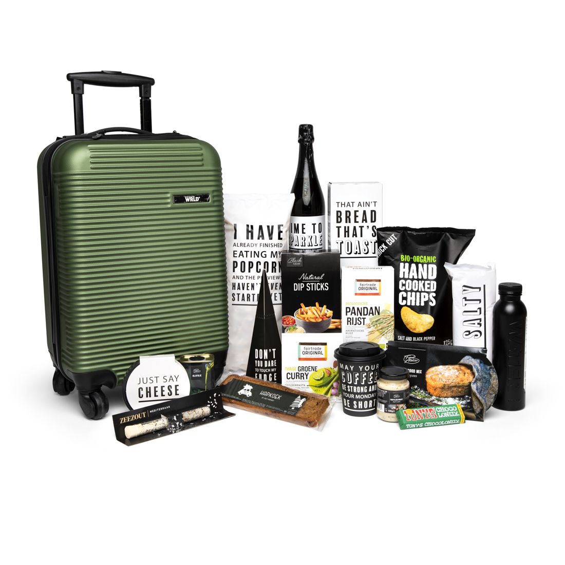Ik ga op reis en neem mee... Deze fijne groene trolley! Geschikt voor alle vliegmaatschappijen en uiterst geschikt als handbagage. Ook voor een weekendje weg leent deze trolley zich uitstekend. En alsof dat nog niet genoeg is, bevat dit kerstpakket ook vele lekkernijen. Dat wordt smullen met z?n allen!