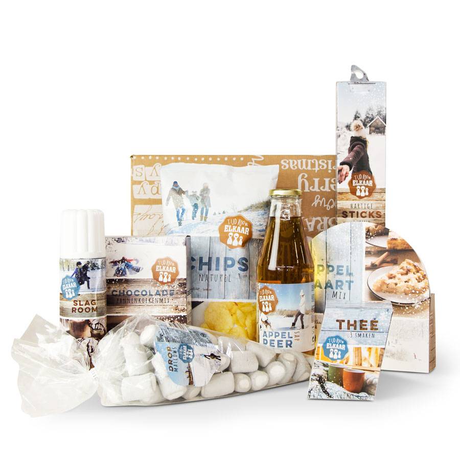 Dit kerstpakket zegt het al: we zijn er altijd voor elkaar. Met kerst wordt dit benadrukt. Kruip gezellig met zijn allen rond te tafel en geniet van heerlijk zelfgemaakte appeltaart en een goed glas chocomelk met slagroom. Genieten ten top!