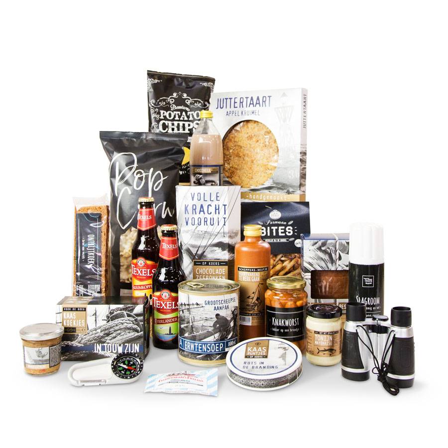 Wie op koers wil blijven moet elke dag opnieuw in touw. Gelukkig hebt u een bemanning waar u het hele jaar op kunt rekenen. Daar doet u graag eens iets voor terug natuurlijk, zeker rond de feestdagen. Bijvoorbeeld met dit stoere Op Koers pakket. Daarin vindt u allerlei zoete en zilte lekkernijen en een erwtensoep die stevig genoeg is om een zuidwesterstorm te doorstaan. Ook een aardewerk kruikje met een alcoholisch drankje voor de crew ontbreekt uiteraard niet. Even voor anker gaan om te genieten hebben ze zeker verdiend - maar daarna is het weer volle kracht vooruit!