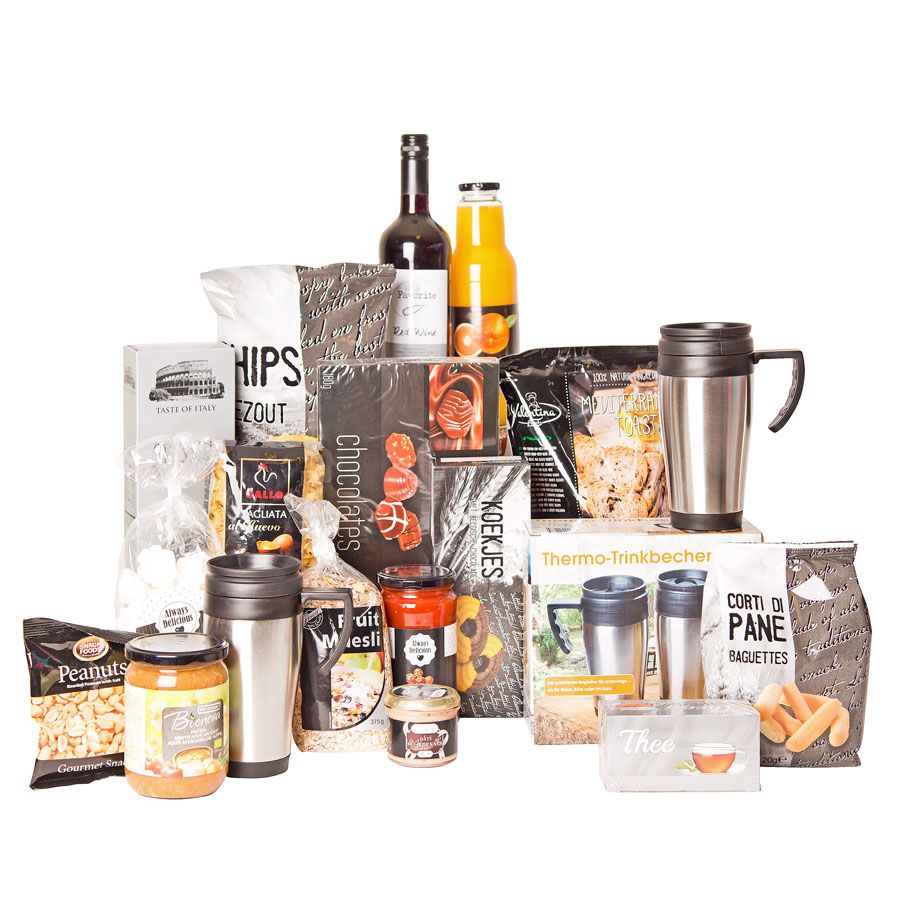 Dit kerstpakket ziet eruit om op te eten, en daar is het natuurlijk ook voor bedoeld! Heerlijke lekkernijen om te eten en te drinken. En de handige thermos drinkbekers komen zowel in de winter als de zomer steeds weer van pas.