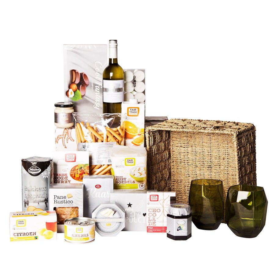 Dit kerstpakket staat voor een sfeervolle kerst met familie en vrienden. De sfeervolle waxinelichtjes (met theelichthouder) en mooie handige mand staan gezellig in uw huiskamer. Heerlijk om in deze sfeer een lekker wijntje te drinken uit onze Fair Trade producten. Geniet van een sfeervolle kerst.