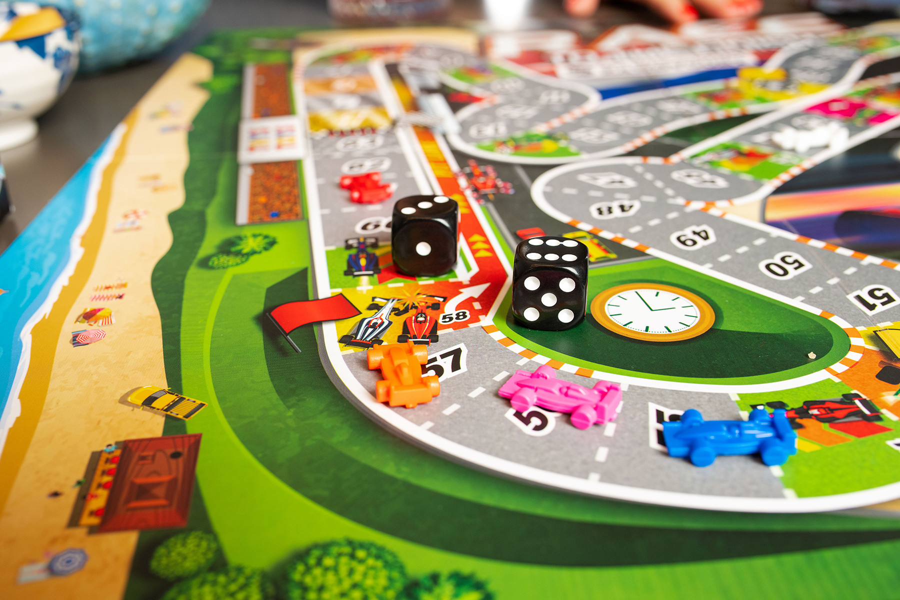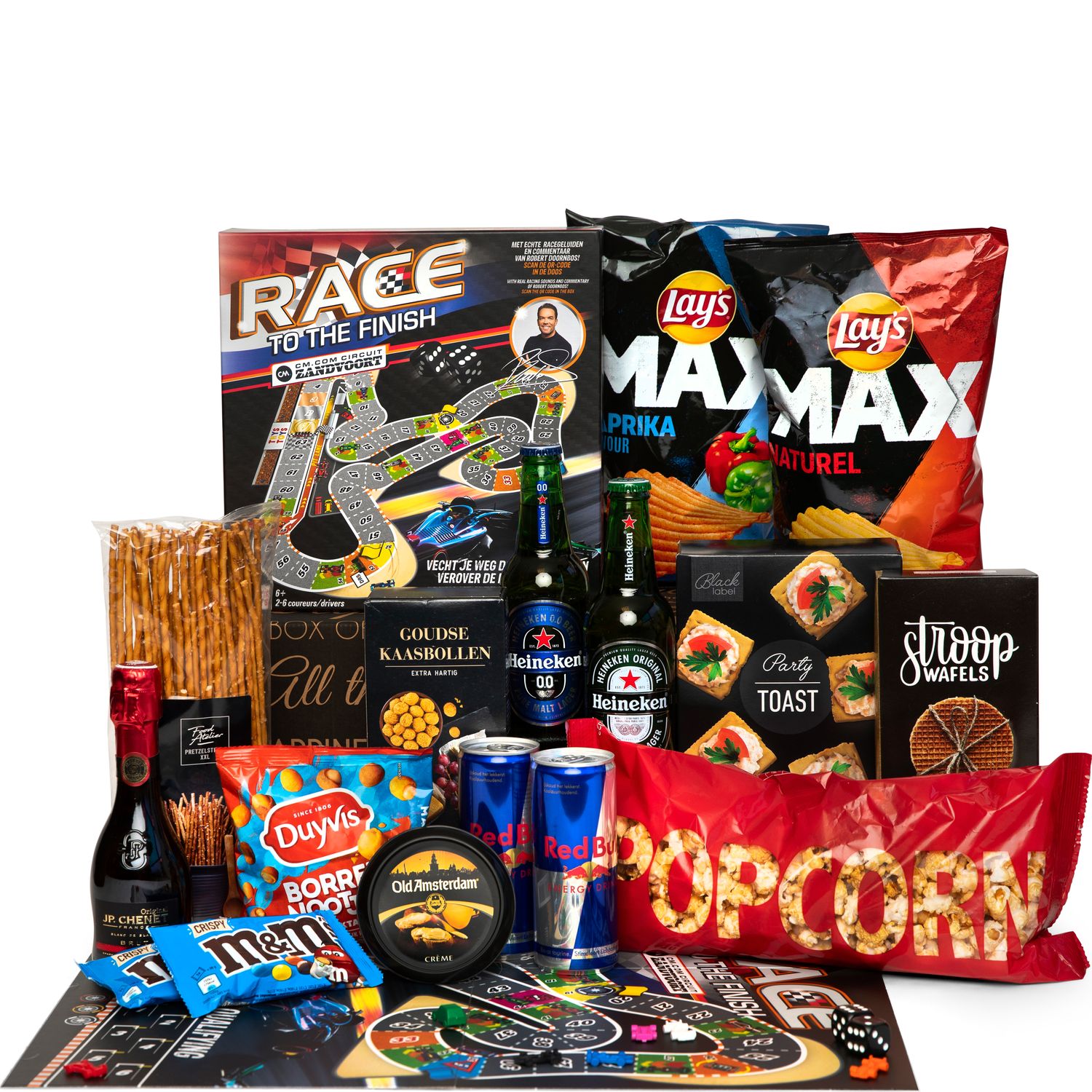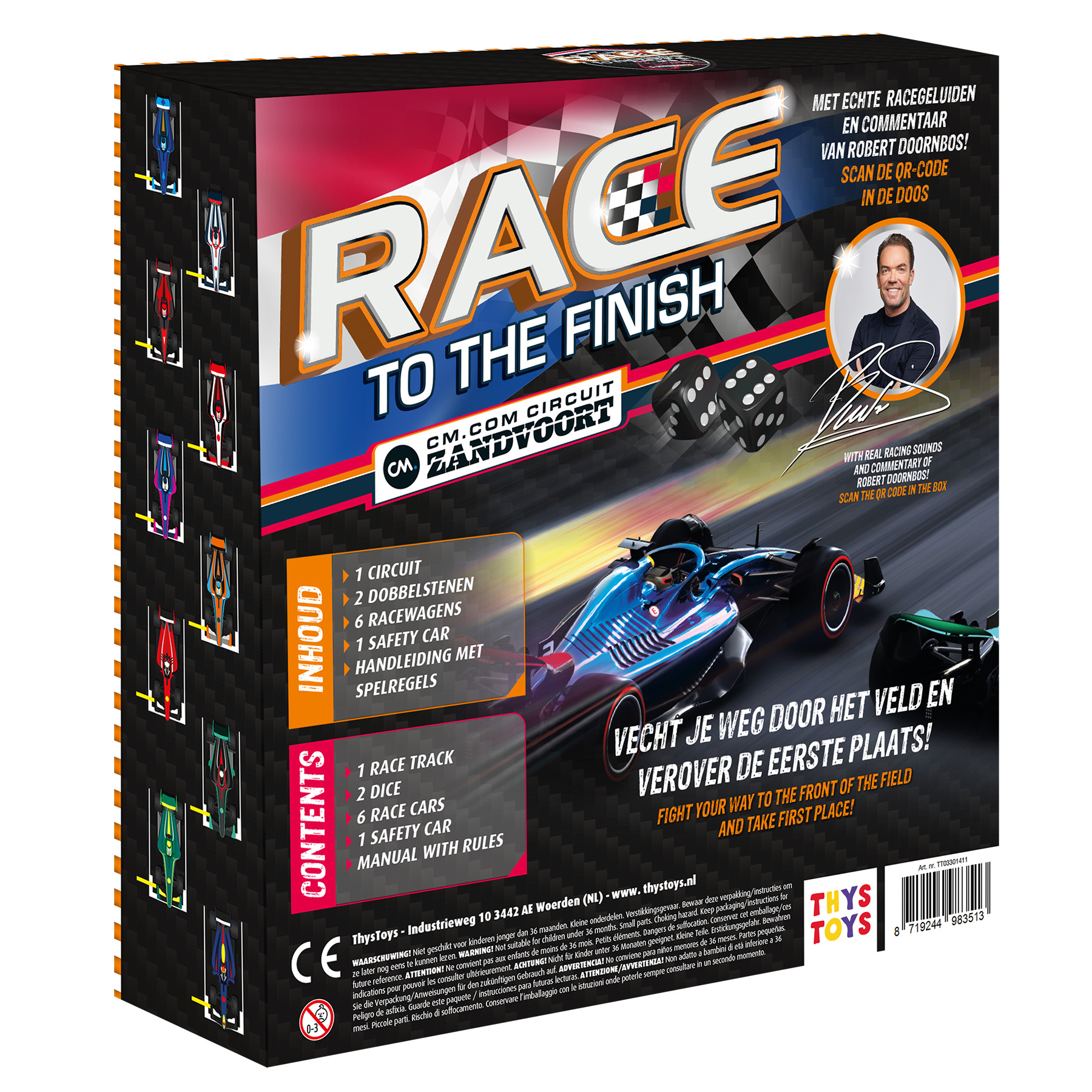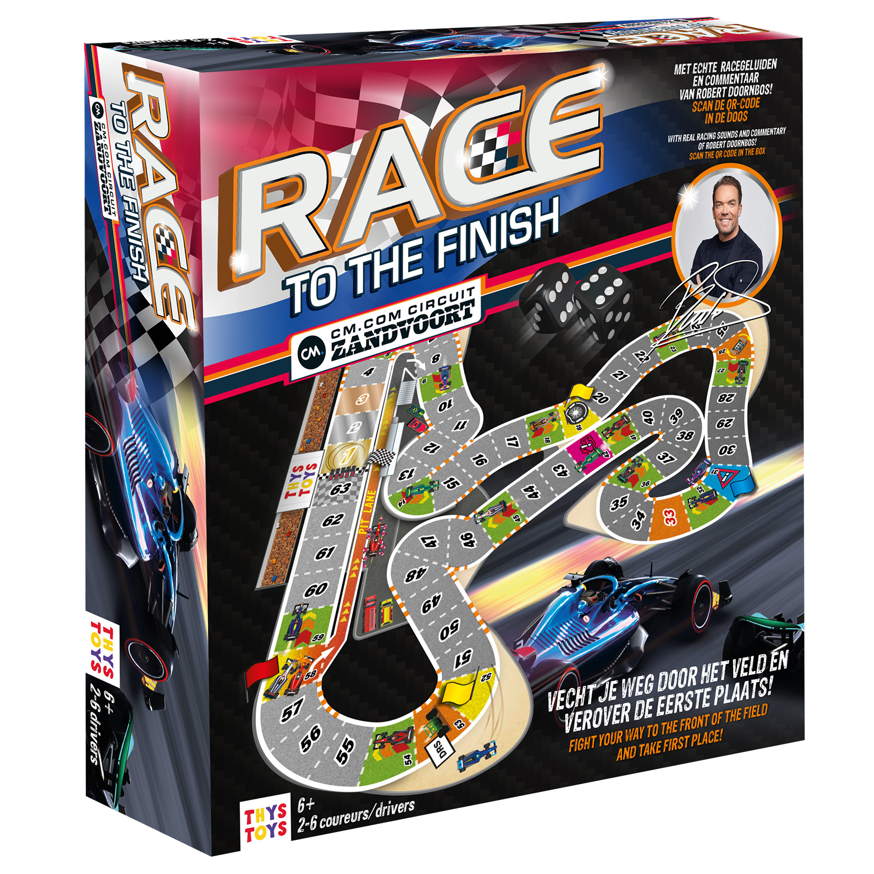 Race to the Finische by Robert Doornbos zorgt gegarandeerd voor een gezellige avond met vrienden. Zorg jij ervoor dat jouw raceauto als eerste over de finish komt? Dan win jij de race! Voel je als een echte coureur en beleef alle voor- en tegenslagendie je kunt hebben in een race. Een echte kwalificatie bepaalt de speelvolgorde. Daarna vecht je je een weg door het veld en probeer je de eerste plaats te veroveren. Op de gekleurde vakken kunnen de coureurs worden gehinderd of juist vooruit wordengeholpen.. Zo kan je auto een lekke band krijgen, in de grindbak belanden of zelfs crashen! Of gaat je DRS open of laat je fantastisch bochtenwerk zien wat je in staat stelt tot een legendarische inhaal-actie?! Terwijl je strijdt om de titel, doet Robert Doornbos verslag. Scan met je telefoon de QR-code en druk op de knoppen om echte racegeluiden te horen. Ben je als eerste over de finish, dan klinkt het volkslied en ben jij de winnaar van het spel: "Race to the Finish". Vergeet niet een mooiedonut achter te laten!