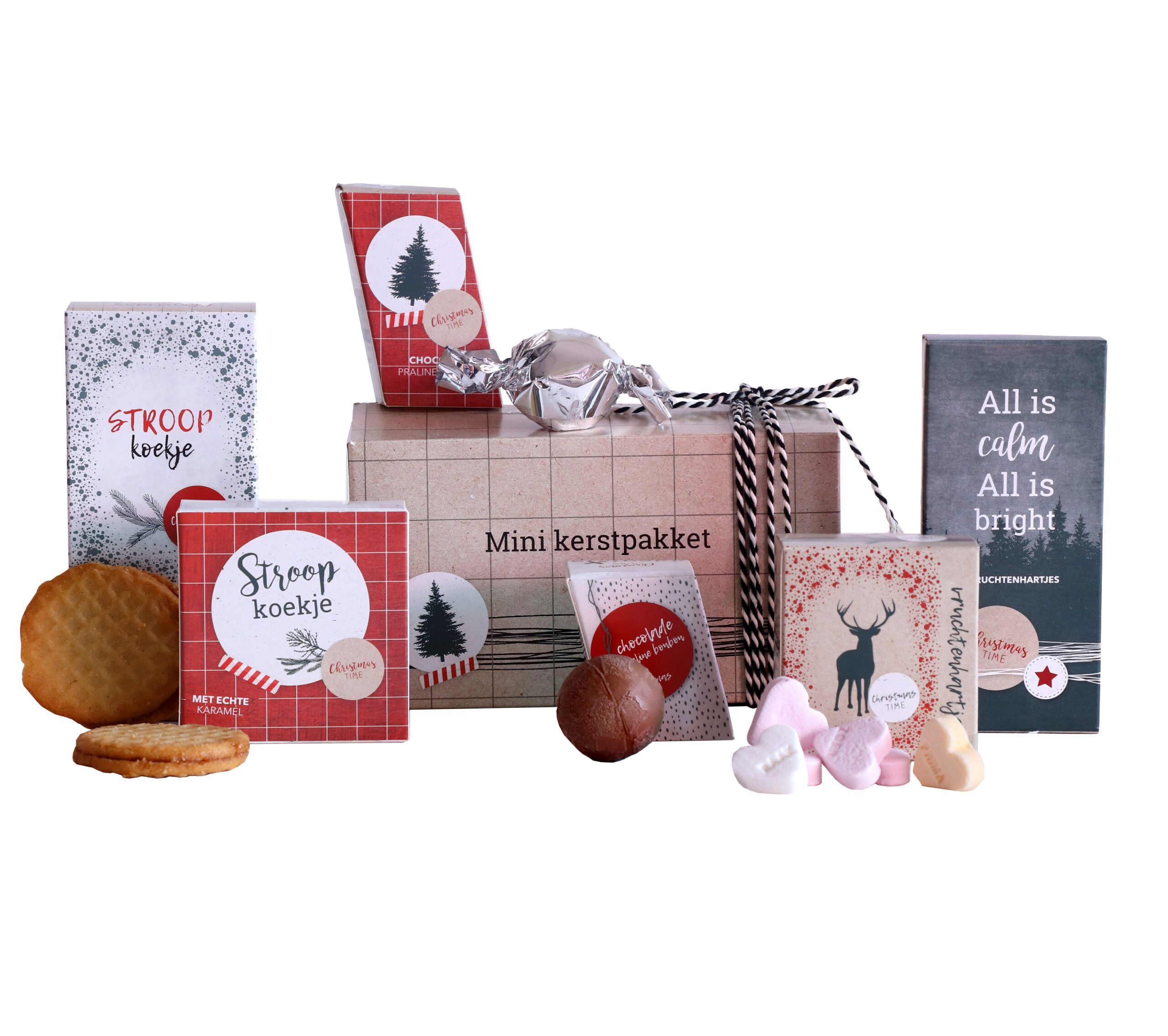 Groots genieten met dit kleine kerstpakketje. Geen groot budget, maar toch een leuke attentie? Dan is dit mini kerstpakket echt iets voor u. 3 verschillende lekkernijen, prachtig verpakt in aparte doosjes, verzameld in een kerstpakketdoos. In de doosjes zitten gaatjes geperforeerd. Met het decoratieve touw, kunt u op een leuke manier de doosjes in de kerstboom hangen.