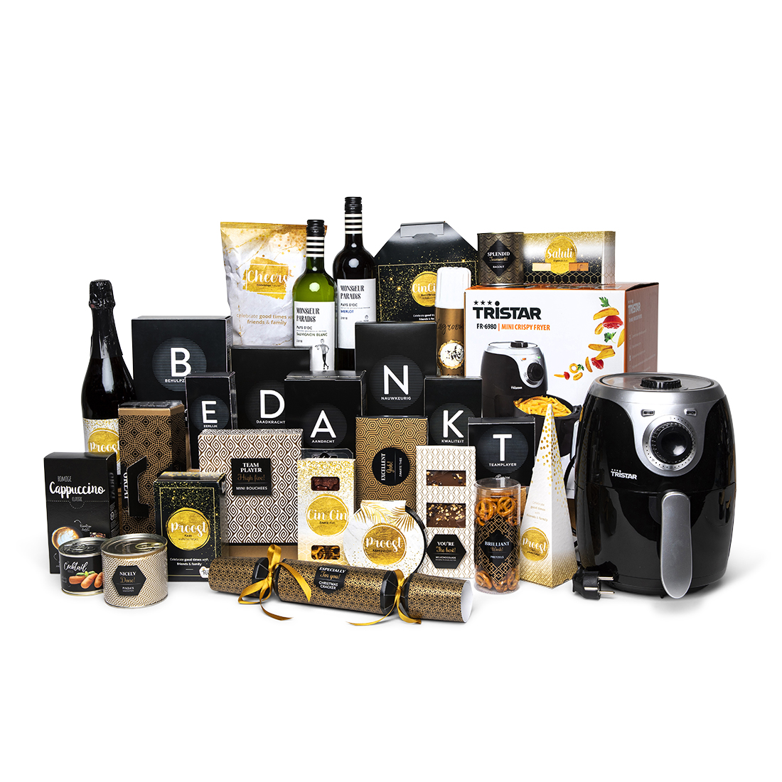Dit sfeervolle kerstpakket zegt alles; Behulpzaam, Eerlijk, Daadkracht, Aandacht, Nauwkeurig, Kwaliteit en Teamplayer. U Bedankt uw medewerkers op een wel heel speciale manier. Dat zal zeker gewaardeerd worden! En de Tristar crispy fryer wil iedereenwel ontvangen. De fryer maakt het mogelijk om te bakken, braden, roosteren, grillen of te frituren zonder het gebruik van olie. Veel gezonder en veel minder vieze geurtjes.