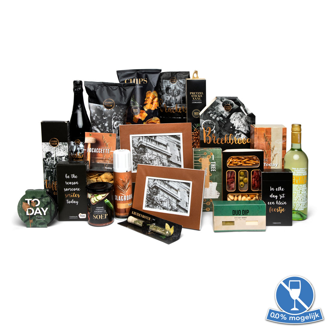 Met dit prachtige kleurrijke kerstpakket kunt u echt uitpakken en uw waardering laten blijken aan uw medewerkers. Van cappuccino met slagroom tot heerlijke wijn met lekkere snacks. U vindt het allemaal in dit sfeervolle pakket met 2 assorti fotolijsten. Dit gezellige pakket is om in te lijsten.