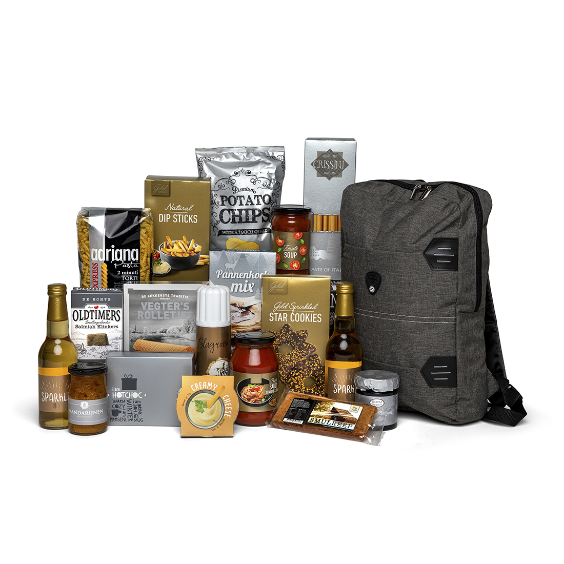 Op en top genieten. Wat wil een mens nog meer? Dit prachtige pakket biedt de allerlekkerste producten voor gegarandeerd geslaagde feestdagen. En de lichtgewicht rugtas komt altijd goed van pas. De tas is uitgevoerd in gemêleerd polyester materiaal. Het hoofdcompartiment van de tas is voorzien van een voering. Als extra zit er een divider in de tas voor bijvoorbeeld een tablet of laptop. Een prettige rugzak voor dagelijks gebruik met een in het oog springend design.