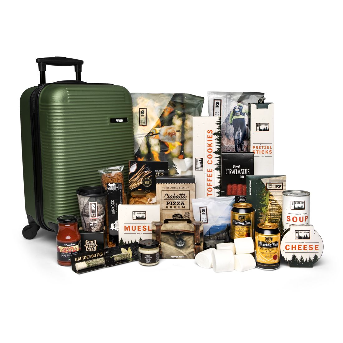 Met deze mooie groene trolley kunt u stijlvol op pad. Het pakket is aangevuld met heerlijke food producten van onze prachtige Outdoor lijn. Een echt cadeautje!