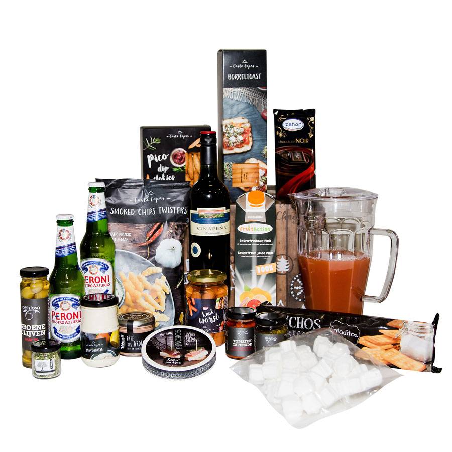 Bent u een echte liefhebber van knakworst, olijven of wijn? Dan zit u helemaal goed met dit pakket! Natuurlijk zitten er ook heerlijke snacks tussen zodat iedereen kan genieten van deze feestdagen. De kan kunt u gebruiken om het drinken om een leuke wijze te serveren.