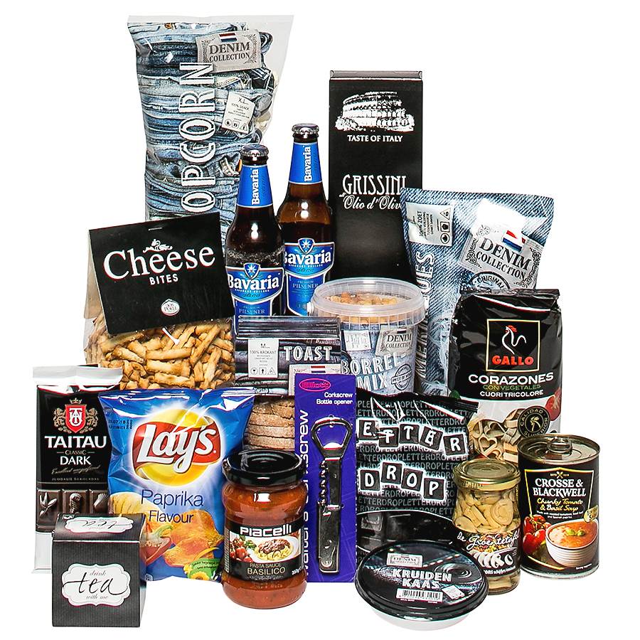 Dit stoere kerstpakket in denim look zit bomvol lekkere artikelen om tijdens de feestdagen van te genieten met de hele familie. Schenk de drankjes maar in en geniet van al deze heerlijke producten. Proost, op je gezondheid!