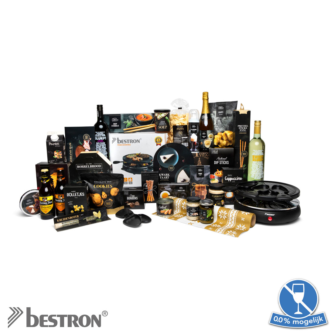 Geniet van het zelf bereiden van eten, samen met familie en vrienden, met de krachtige Bestron raclette grill. De grillplaat en 6 bakpannetjes hebben een antiaanbaklaag. De behuizing is gemaakt van hittebestendig materiaal. De elektrische grill is ook uitgerust met een aan-/uitschakelaar met ge?ntegreerd indicatielichtje en antislip poten en is geschikt voor het grillen van vlees, vis en groenten met familie. Daarnaast bevat dit bomvolle, culinaire kerstpakket een leuke tafelloper en heerlijke producten die zeker goed van pas zullen komen tijdens de feestdagen!