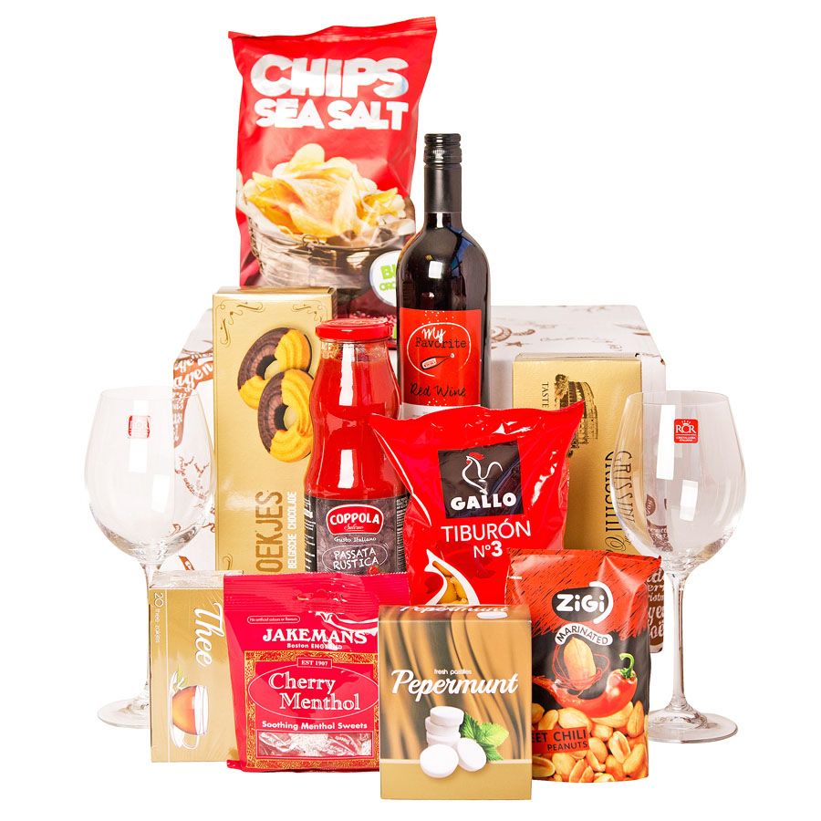 Dit pakket is speciaal voor de Bourgondiërs onder ons, die graag wijn drinken uit mooie kristallen RCR wijnglazen. Een paar nootjes of chips erbij en veel meer is er niet nodig om een avondje te ontspannen.