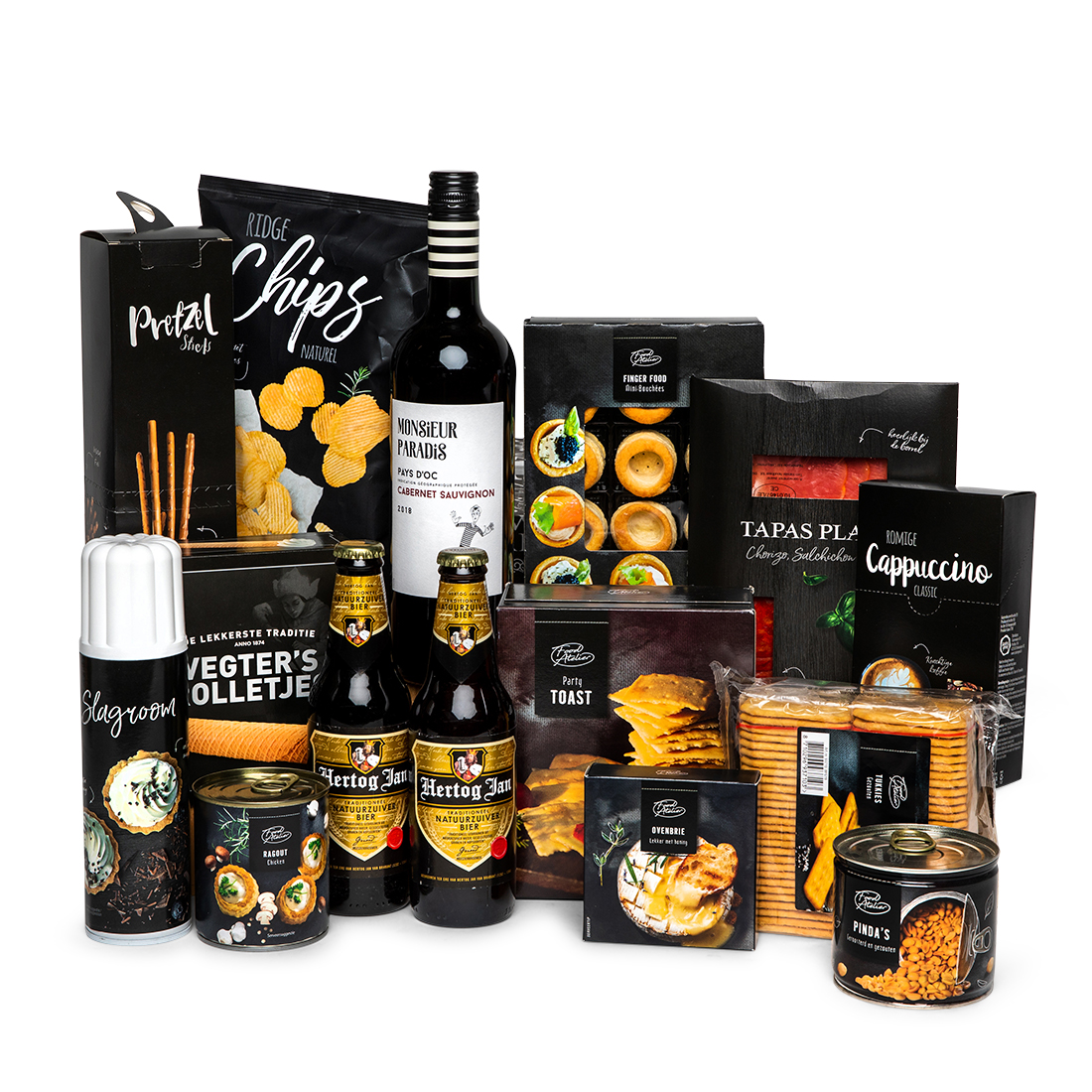 Geniet samen van een goed glas wijn, een lekker koud biertje en de lekkere snacks uit dit bourgondische kerstpakket. Fijne avond!