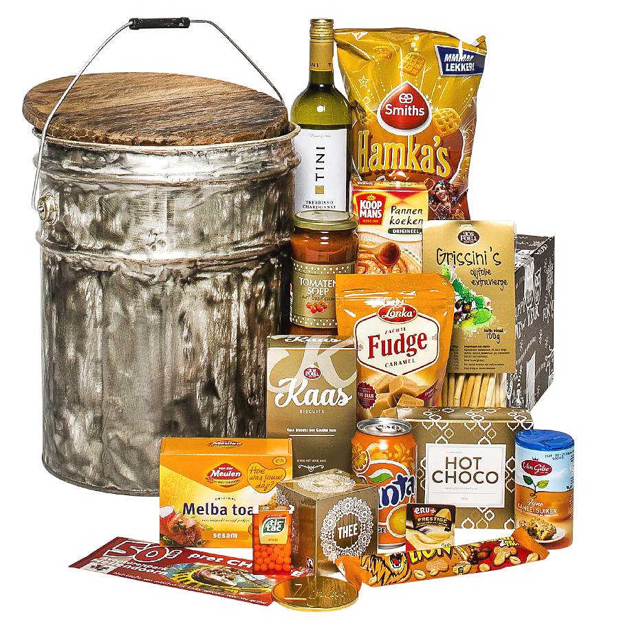 De diversiteit van dit goed gevulde pakket zal u verbazen. Heerlijke producten voor jong en oud. En komt er onverwachts nog meer visite? Dan schuift u makkelijk de bucket stoel bij, een handige en decoratieve zitplaats waarin u ook nog uw spullen kunt bewaren.