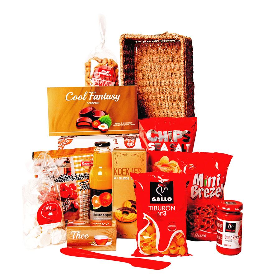 Dit mandje - gemaakt van zeegras - maakt iedereen blij. Het zit namelijk vol met lekkere dingen zoals toastbrood, meringues en koekjes met Belgische chocolade. Bovendien zit er een siliconen spatel bij om bijvoorbeeld te gebruiken bij het maken van een geglazuurde cake.