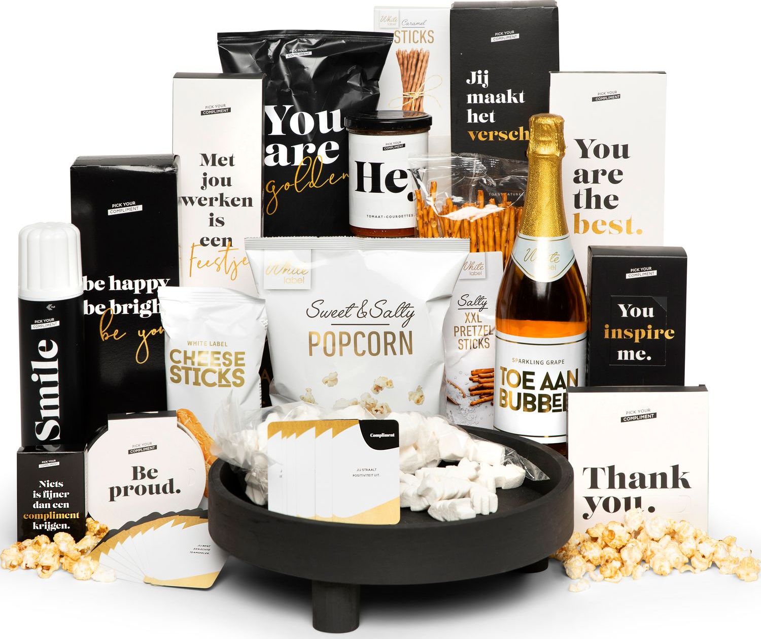 Maak van het uitreiken van het kerstpakket een betoverend feestje. Dit pakket is een welgemeend bedankje aan alle medewerkers, die dit jaar weer hard hebben gewerkt. Op het trendy zwarte deco plateau op pootjes show je je favoriete hapjes, accessoires, kaarsenhouders en vaasjes. Het complimentenspel is ontworpen om positiviteit, waardering en vriendelijkheid te verspreiden. Speel het met een groep vrienden, familie of collega's. Want niets is fijner dan een compliment te krijgen.