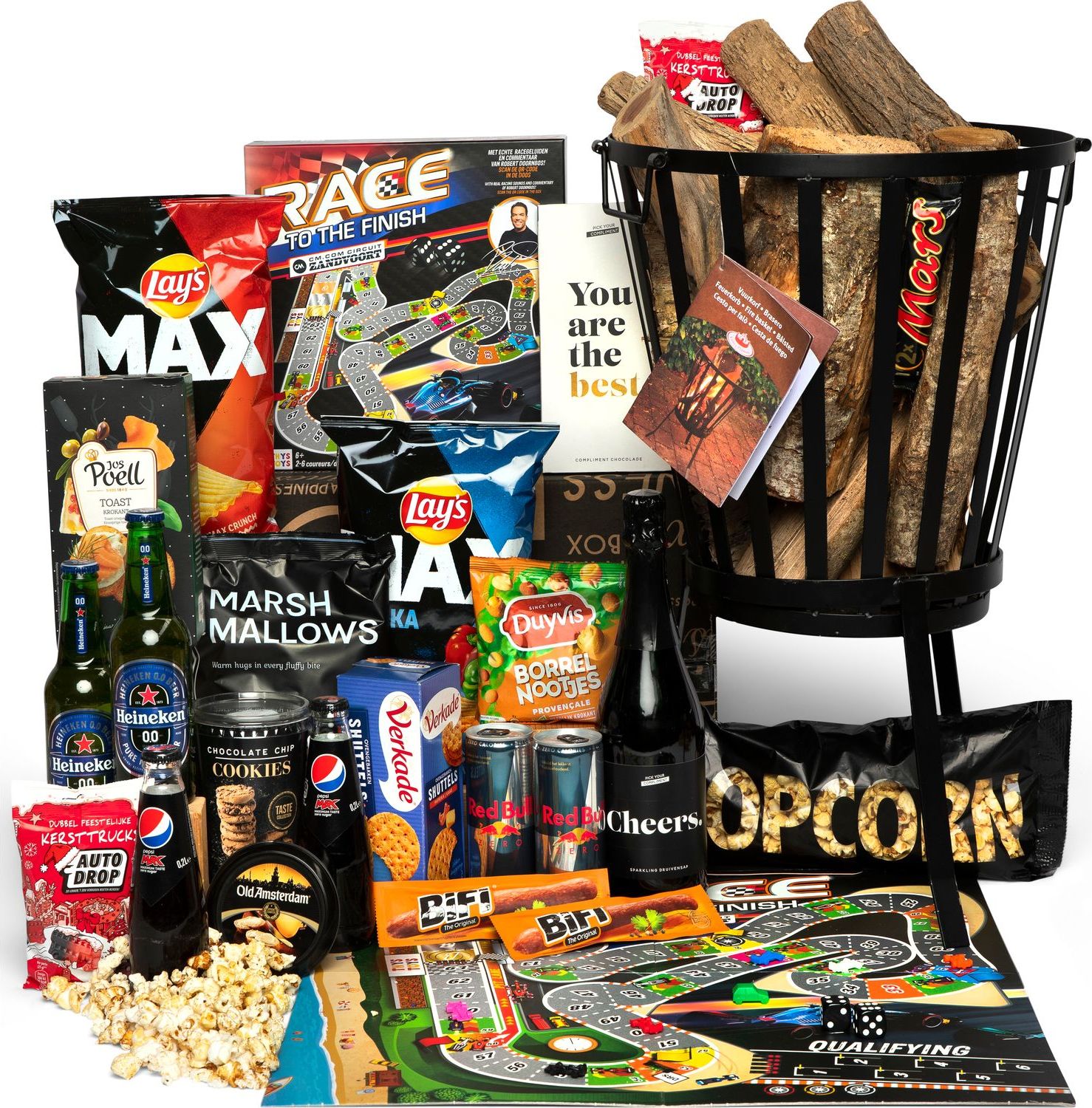 Niets is gezelliger dan samen rond een vuurtje te zitten. Deze metalen vuurkorf is ideaal voor in de tuin en eenvoudig te gebruiken. Met deze stoere vuurkorf creëer je een heerlijke warmte en gezellige sfeer. Met dit pakket is een gezellige race avond met vrienden is niet meer weg te denken dankzij dit geweldige Race to the Finisch spel van Robert Doornbos. Zorg jij ervoor dat jouw raceauto als eerste over de finish komt? Dan win jij de race! Voel je als een echte coureur en beleef alle voor- entegenslagen die je kunt hebben in een race. Een echte kwalificatie bepaalt de speelvolgorde. Daarna vecht je je een weg door het veld en probeer je de eerste plaats te veroveren. Op de gekleurde vakken kunnen de coureurs worden gehinderd of juist vooruit worden geholpen. Zo kan je auto een lekke band krijgen, in de grindbak belanden of zelfs crashen! Of gaat je DRS open of laat je fantastisch bochtenwerk zien wat je in staat stelt tot een legendarische inhaal-actie?! Terwijl je strijdt om de titel, doet Robert Doornbos verslag. Scan met je telefoon de QR-code en druk op de knoppen om echte racegeluiden te horen. Ben je als eerste over de finish, dan klinkt het volkslied en ben jij de winnaar van het spel: Race to the Finish. Vergeet niet een mooie donut achter te laten.