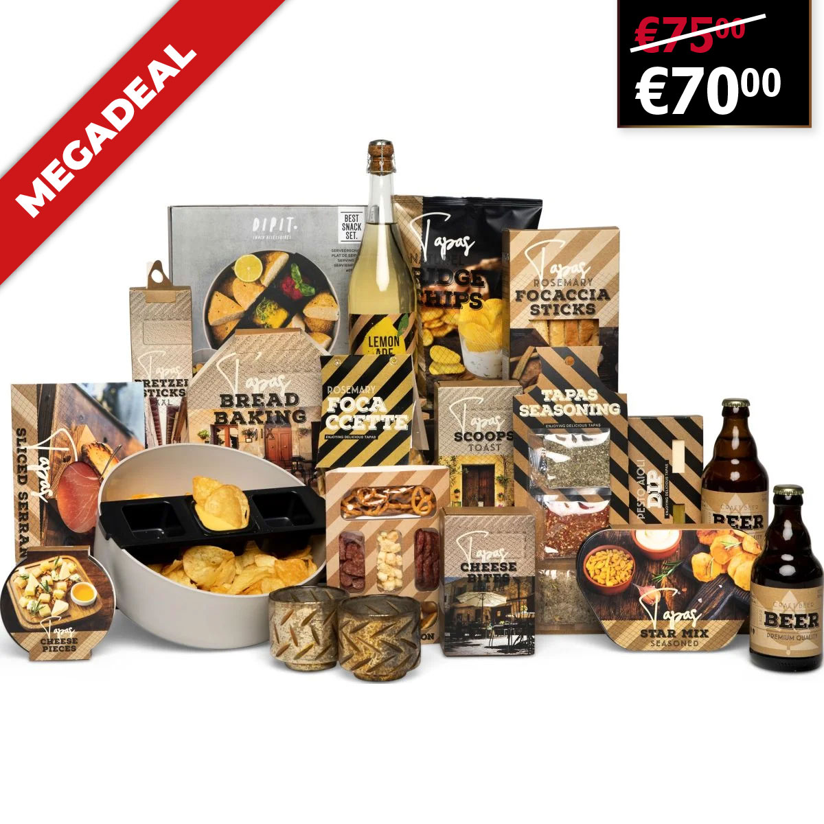 Spreek af met je vrienden voor een gezellige avond tapas. De lekkerste tapas hapjes komen op tafel. Met dit rijk gevulde tapas pakket ben je verzekerd van de beste tapas. En de handige Dipit serveerschaal met dipbakje mag natuurlijk niet ontbreken. Ideaal voor stokbrood, chips of salade.