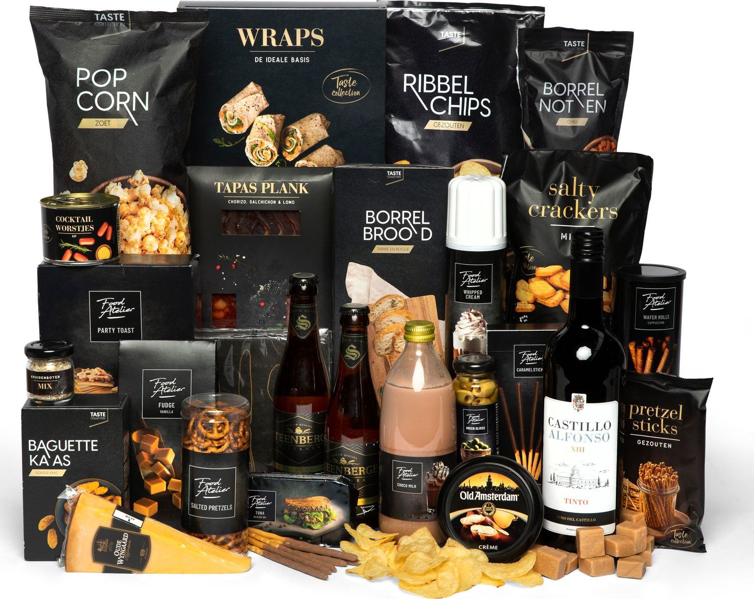 Zo'n luxe kerstpakket heeft iedereen op zijn verlanglijstje staan. Een doos vol met smaakvolle producten die het nieuwe jaar waarschijnlijk niet eens halen, zo lekker en bruikbaar. Van chocomel met slagroom, fudge of wafelrolletjes, van borrelbroodmet Old Amsterdam, kruidenboter of tonijn. Onder het genot van een goed glas wijn en een ijskoud biertje geniet je en kom je helemaal tot rust. Ja, met dit verwen pakket kom je de feestdagen wel door.