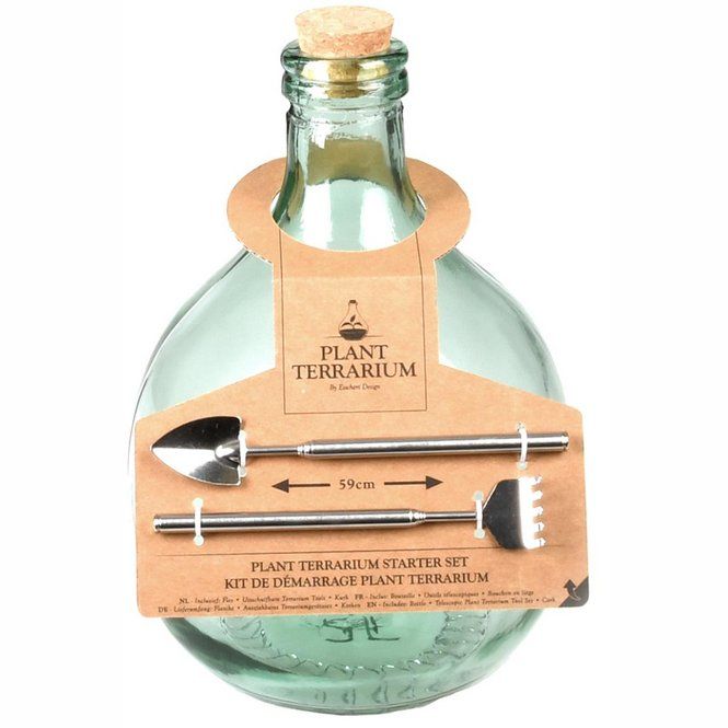 Maak uw eigen terrarium ecosysteem met deze gerecyclede glazen buikfles van 5 liter. Een terrarium maken is de nieuwste trend en met deze handige start set nog eenvoudiger om te maken. De terrarium buikfles wordt compleet geleverd met handige toolset: harkje en schepje. Deze tools komen goed van pas bij het inrichten en het onderhouden van de fles. En met behulp van inspirerende upcycle tips kunt u de verpakkingen uit dit pakket eenvoudig een tweede leven geven.