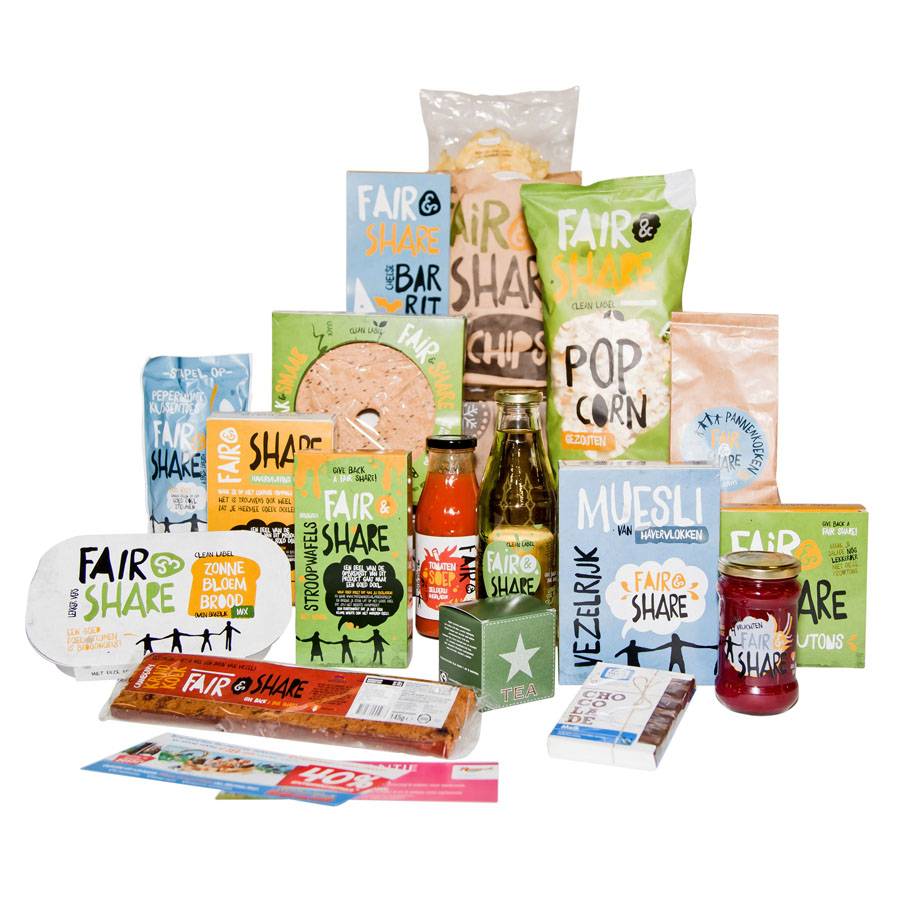 De puurheid van de (h)eerlijke producten uit dit Fair & Share pakket wordt versterkt door de speelse, eigenwijze, kleurrijke uitstraling. En van de opbrengst van Fair & Share producten gaat een deel naar de Voedselbank of Stichting Present. Give back a Fair Share: iedereen mag horen van die boodschap!