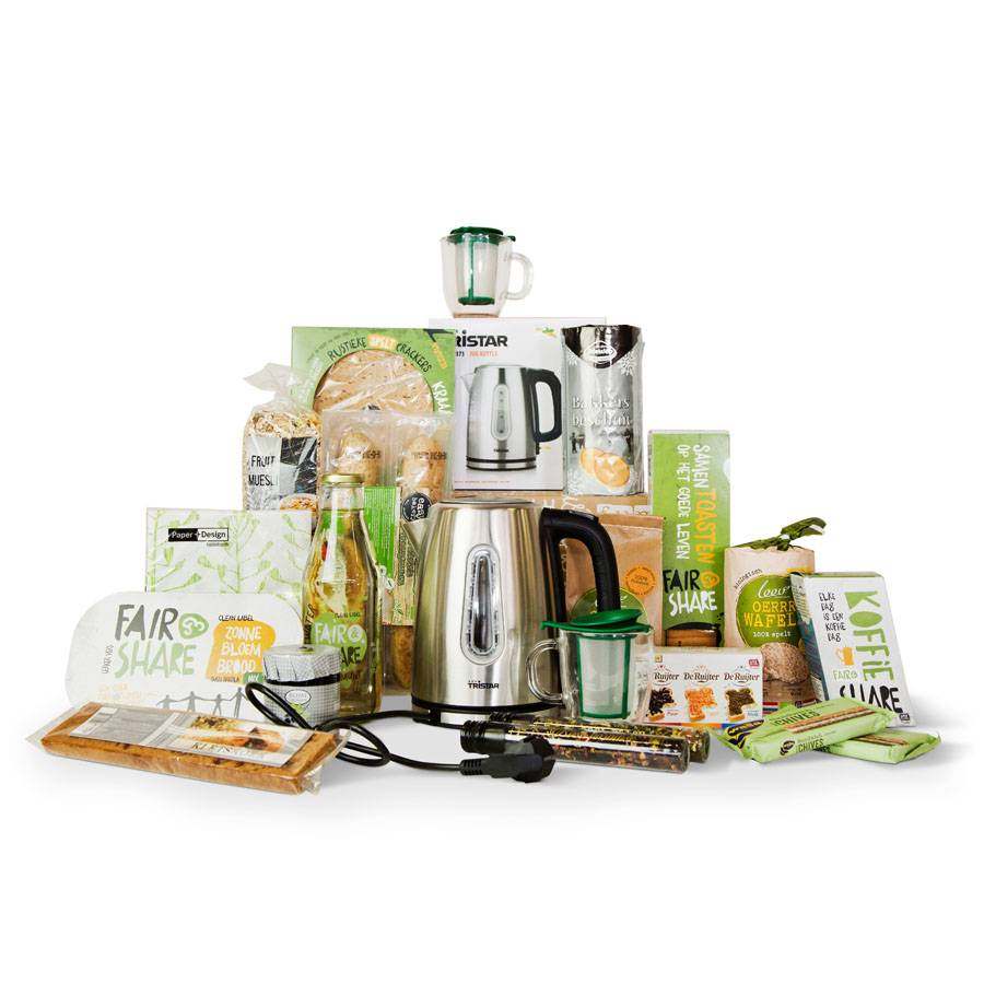Met dit royale kerstpakket geeft u uw blijk van waarding aan uw medewerker en helpt u mee aan een betere wereld. Met een groen kerstpakket geeft u meer dan alleen een prachtig kerstpakket. Gevuld met de heerlijkste lekkernijen en een prachtige RVS waterkoker.