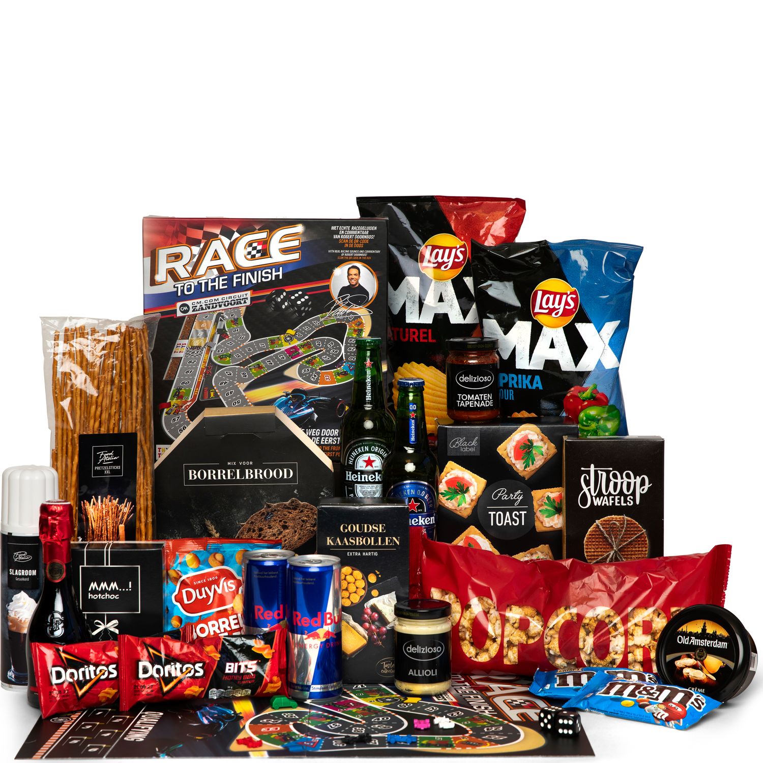 Ben je als eerste over de finish, dan klinkt het volkslied en ben jij de winnaar van het spel: "Race to the Finish". Vergeet niet een mooie donut achter te laten! Met dit geweldige spel en de smaakvolle producten iseen avond gezelligheid niet meer weg te denken.