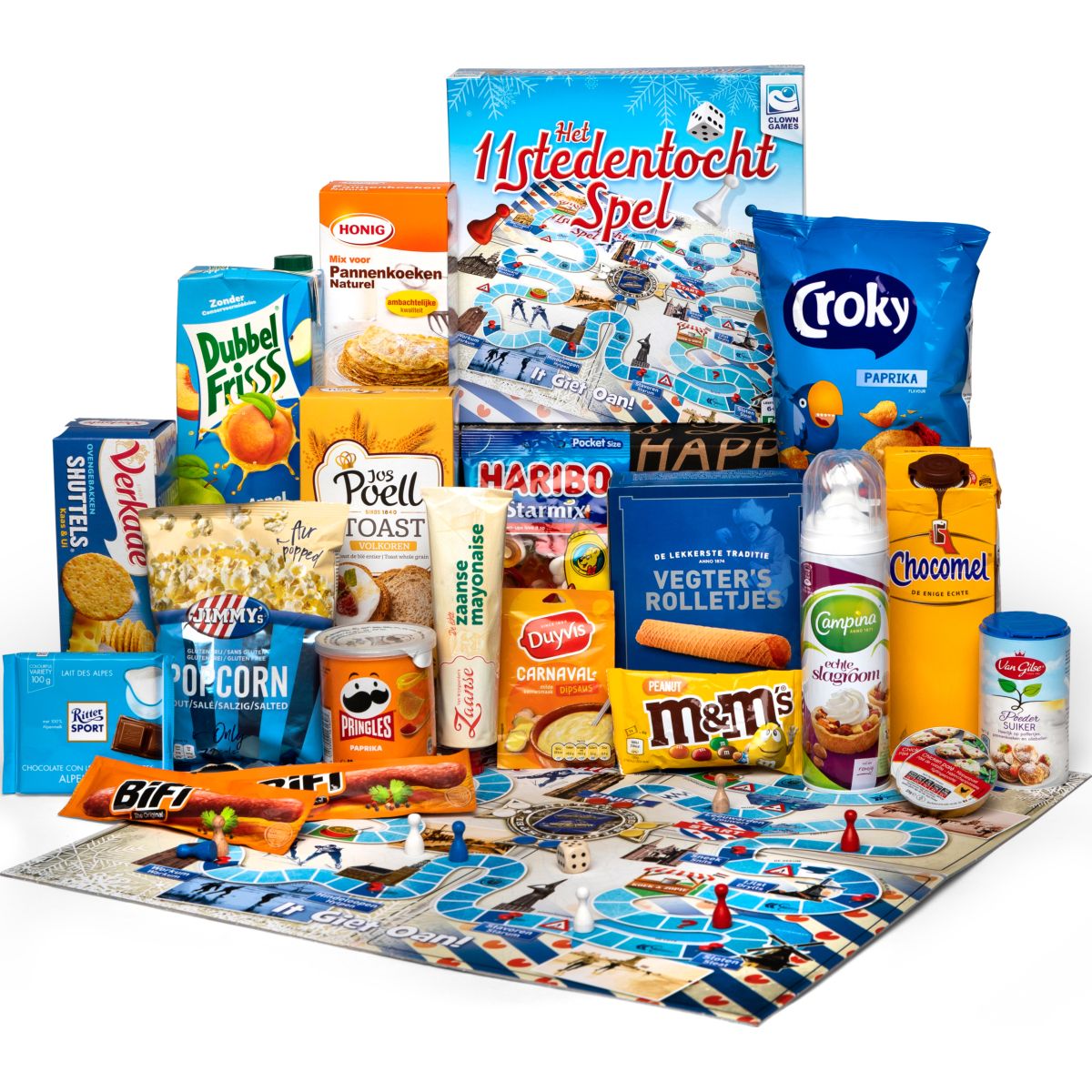 Dit rijk gevulde A-merken kerstpakket bevat het 11-Stedentochtspel. Wie is als eerste bij de finish en wint het felbegeerde Elfstedenkruisje? Gooi met de dobbelsteen en verplaats de pion met het aantal ogen dat is gegooid. Wanneer je op een van de vakjes komt met een plaatje, voer dan de opdracht uit die bij het plaatje hoort. Als je bijvoorbeeld moet klunen, sla je een beurt over. Of heb jij de wind in de rug en telt je worp dubbel? De speler die als eerste over de finish komt, wint de Elfstedentocht. Dat wordt gegarandeerd een gezellige avond